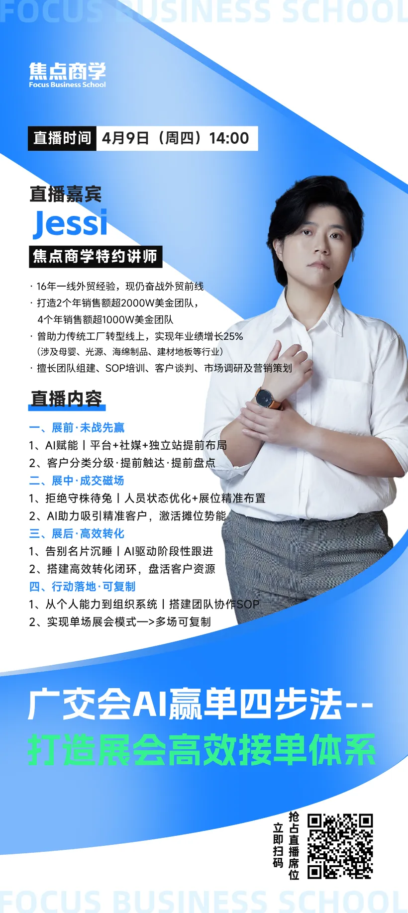 4月9日(本周四)14:00,焦点商学特邀16年外贸实战大咖Jessi老师,带来《广交会 AI 赢单四步法——打造展会高效接单体系》。用 AI 工具重构展前、展中、展后全流程,助你搭建一套可落地、可复制的展会成交系统。