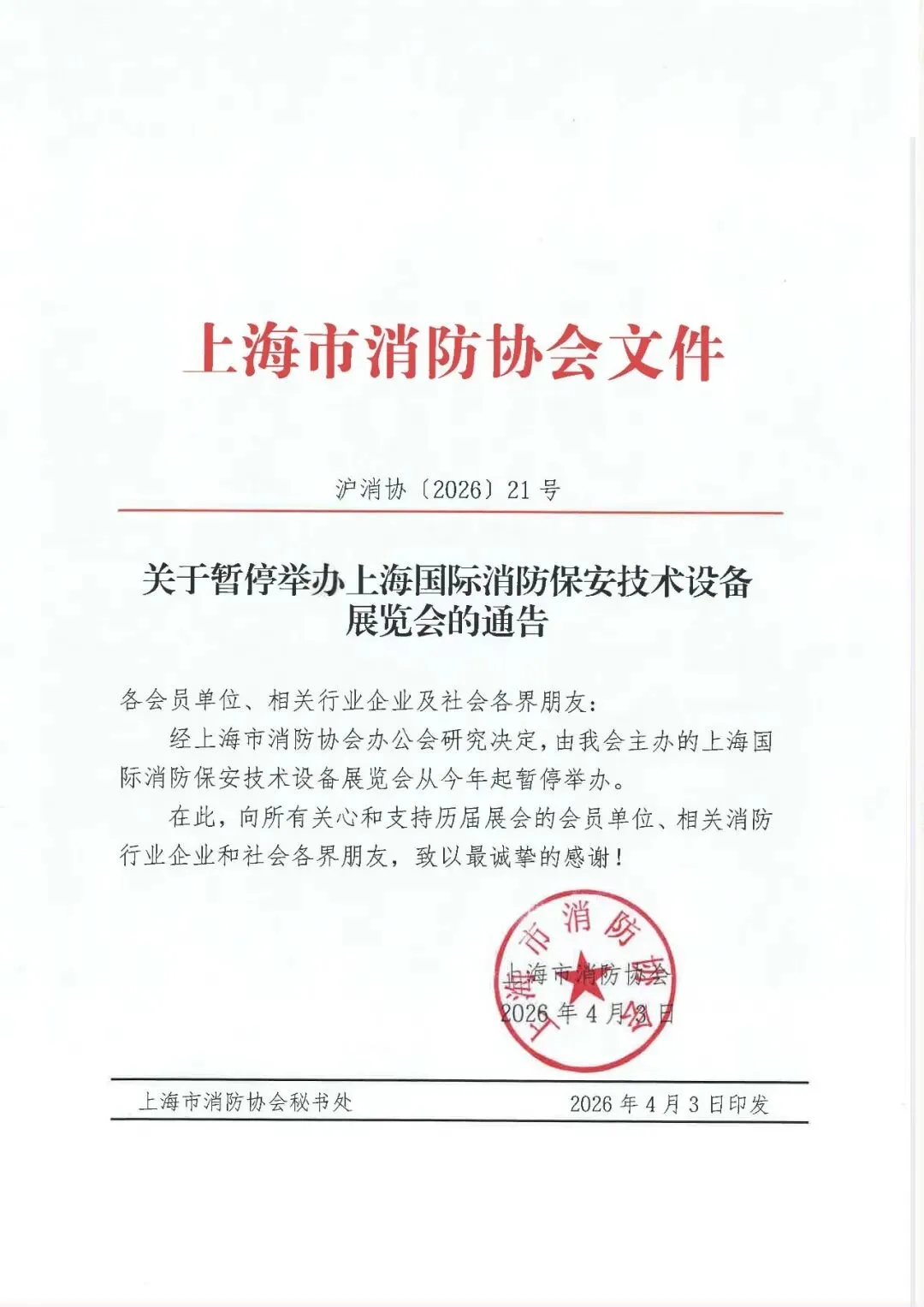 关于暂停举办上海国际消防保安技术设备展览会的通告
