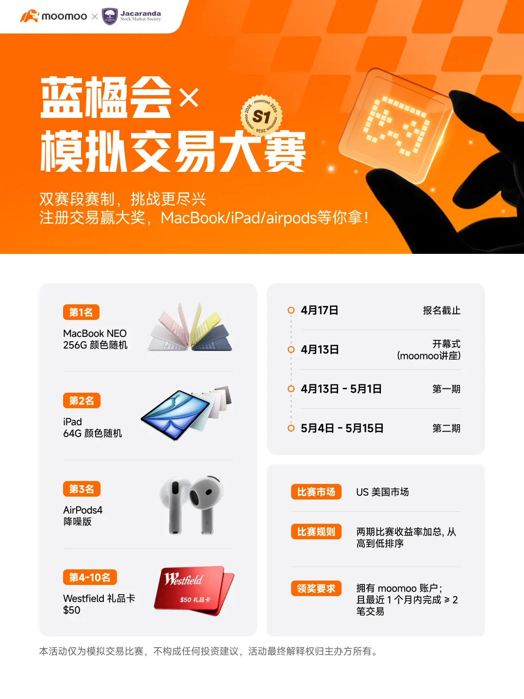 蓝楹会作为一个崇尚坚韧、智慧精神的团队,专注于为会员提供最新的金融知识和实践机会。本次活动我们将与Moomoo合作,举办美股模拟交易大赛。