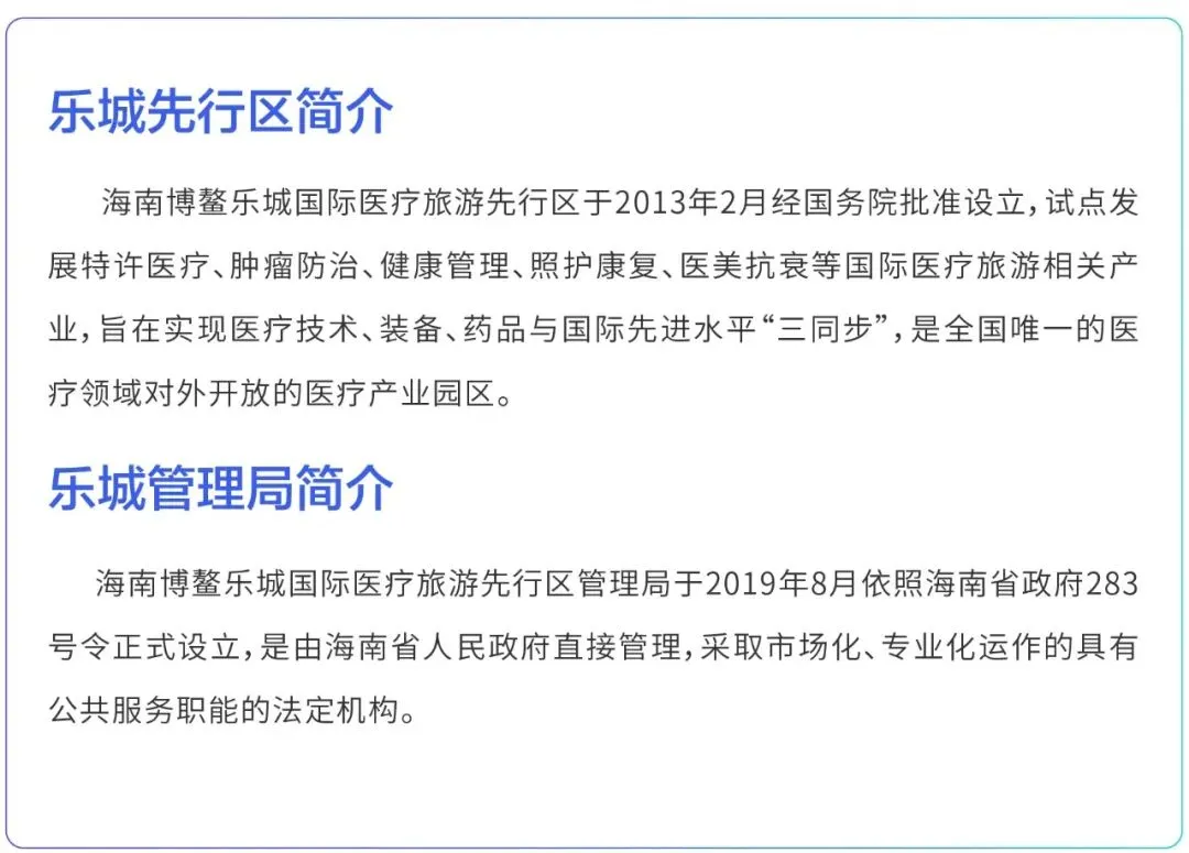 依托园区汇聚的国际创新药械、特殊食品、生物医学新技术和优质医疗资源,乐城围绕肿瘤精准诊疗、慢病管理、亚健康调理、医疗美容、眼科诊疗、重大疾病早筛早诊等重点领域,推出一批使用前沿医疗技术和产品的健康解决方案,系统展示乐城的综合服务能力。