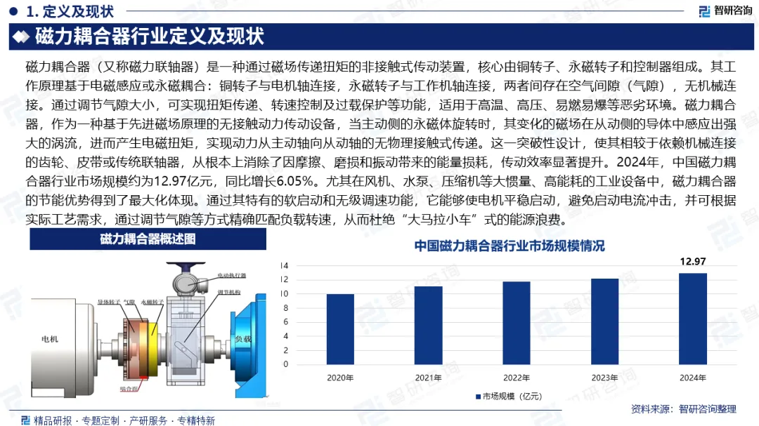 市场规模:磁力耦合器,作为一种基于先进磁场原理的无接触动力传动设备,当主动侧的永磁体旋转时,其变化的磁场在从动侧的导体中感应出强大的涡流,进而产生电磁扭矩,实现动力从主动轴向从动轴的无物理接触式传递。这一突破性设计,使其相较于依赖机械连接的齿轮、皮带或传统联轴器,从根本上消除了因摩擦、磨损和振动带来的能量损耗,传动效率显著提升。2024年,中国磁力耦合器行业市场规模约为12.97亿元,同比增长6.05%。尤其在风机、水泵、压缩机等大惯量、高能耗的工业设备中,磁力耦合器的节能优势得到了最大化体现。通过其特有的软启动和无级调速功能,它能够使电机平稳启动,避免启动电流冲击,并可根据实际工艺需求,通过调节气隙等方式精确匹配负载转速,从而杜绝“大马拉小车”式的能源浪费。
