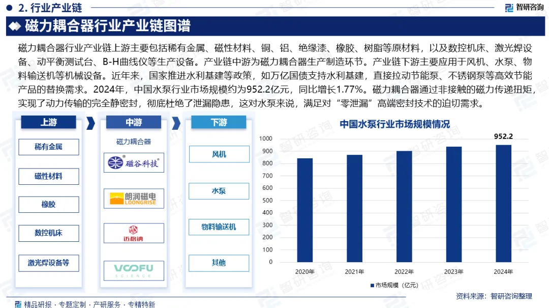 行业发展有利因素:政策驱动方面,国家推进水利基建等政策(如万亿国债支持)直接拉动节能泵、不锈钢泵等高效节能产品替换需求,2024年水泵行业规模达952.2亿元,同比增长1.77%,磁力耦合器“零泄漏”特性契合其高端密封需求。技术优势显著,通过非接触磁力传递扭矩实现静密封,杜绝泄漏隐患,软启动与无级调速功能避免启动电流冲击,精确匹配负载转速,杜绝“大马拉小车”浪费,在风机、水泵、压缩机等大惯量设备中节能优势突出,传动效率提升。市场需求多元,新能源产业(风电/光伏/储能)在“双碳”目标下需求快速增长,高端智能制造(工业机器人/自动化生产线)对传动精度、响应速度要求极高,化工/制药等流程工业对“零泄漏”需求迫切。