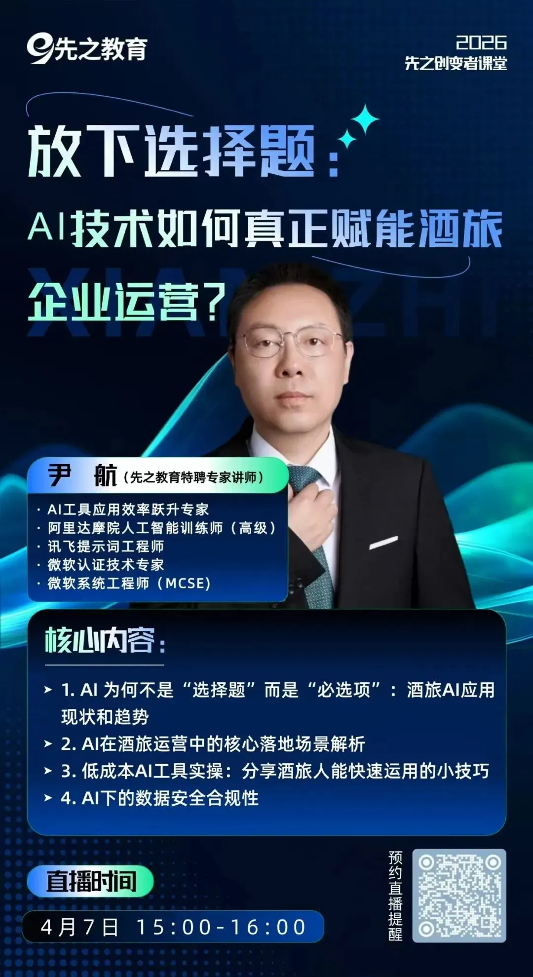 先之教育特邀AI工具应用效率跃升专家尹航老师,于4月7日15:00-16:00开讲《放下选择题:AI技术如何真正赋能酒旅企业运营?》。从酒旅AI应用的行业趋势,到核心落地场景拆解;从低成本AI工具实操技巧,到数据安全合规避坑,全是能直接上手的干货!