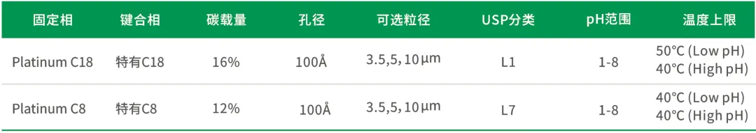Platinum色谱柱高载量的设计,比表面积最大化,使得该系列具有出色的载样量,作为通用型色谱柱具有C18/C8柱可供选择。