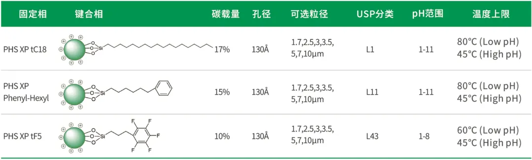 PHS XP系列色谱柱采用表面带电荷的杂化硅胶技术,为碱性化合物提供对称、卓越的峰形。表面微量正电荷在低离子强度的分离体系中与被电离的碱性化合物相互排斥,抑制了碱性化合物和残留硅醇基的离子交换作用,达到改善碱性化合物峰形的目的。该系列色谱柱提供从UPLC/UHPLC、HPLC到制备色谱的规格,从而使方法开发、方法转移更高效更有连续性。