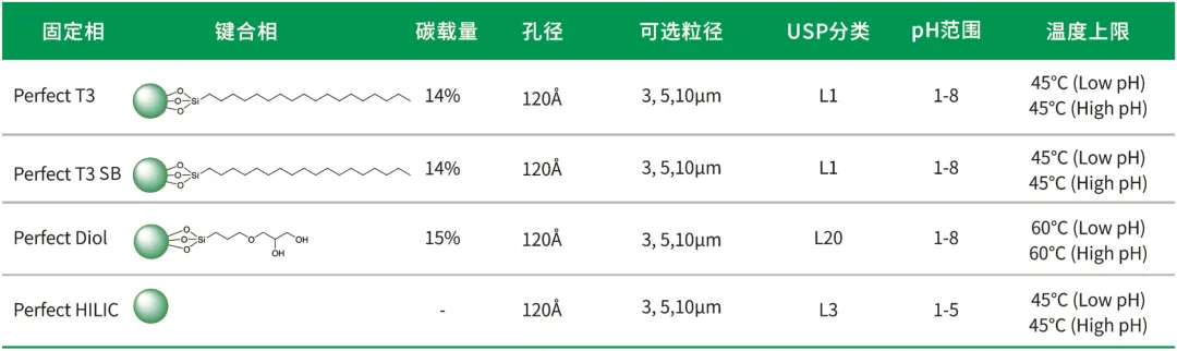 Perfect系列色谱柱适用于极性化合物的分析,在反相或者HILIC条件下保留和分离极性分析物,并使用微纯特有的封端技术,使化合物的峰形更优异。Diol可用于反相与亲水作用模式,也可作正相硅胶柱使用。HILIC适用于亲水作用模式分离极性化合物,也可以作为正相硅胶柱使用。T3在反相上加强了极性化合物的保留,从而多维度为极性化合物分析提供选择。