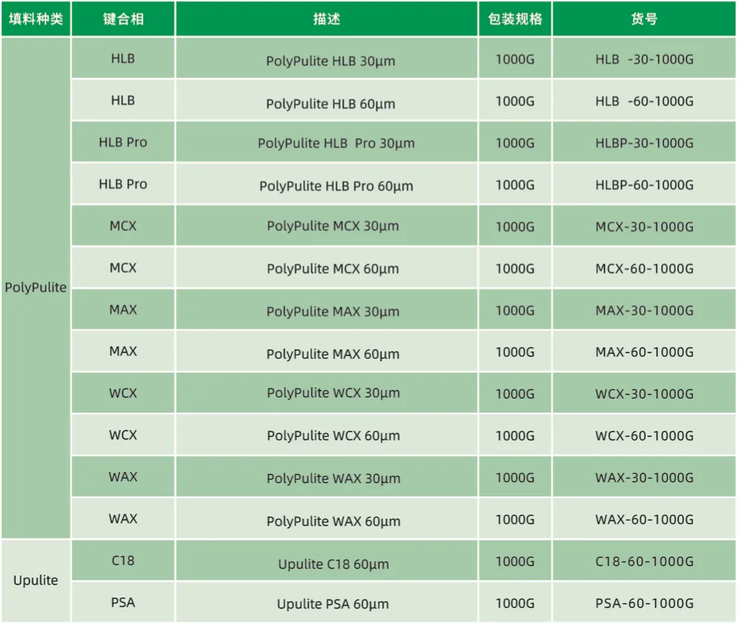 Upulite®聚合物基质填料克服了传统硅胶基质填料的缺点,具有pH使用范围宽、表面没有活性羟基、容量大、回收率高等特点,在食品、环境、临床等领域有广泛应用,目前有HLB、HLB Pro、MCX、MAX、PWCX、PWAX等类型可供选择。