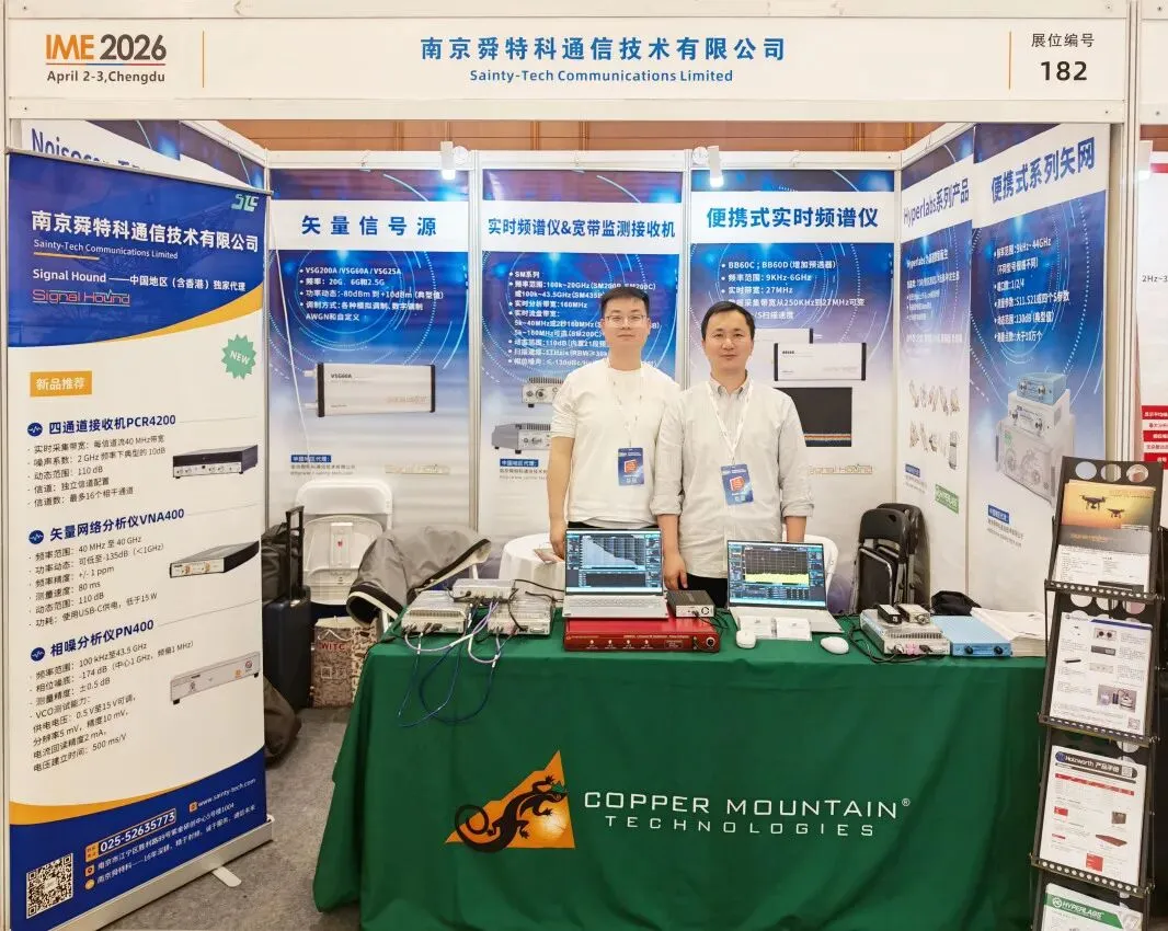 南京舜特科在此次展会上展示了独家代理品牌Signal Hound的新产品相噪分析仪PN400、矢量信号发生器VSG200以及特色产品频谱分析仪SM435B、SM200B等,Copper Mountain双端口便携式矢网模块SC5090和单端口矢网R60,还包括微波射频等领域的创新解决方案。