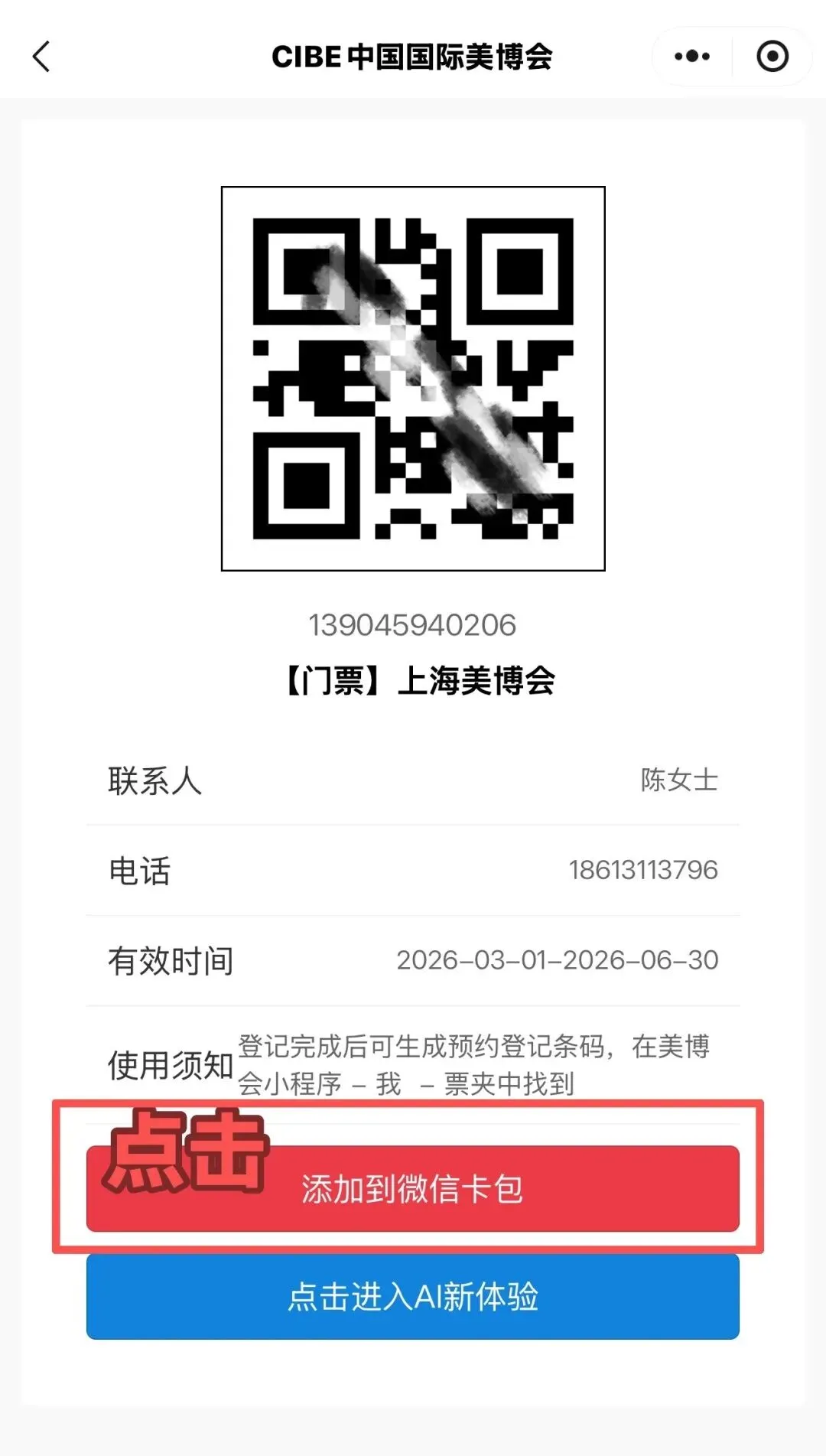 答:登记完成后,在微信“我-卡包-票证”就能找到二维码,提前截图保存到相册,现场凭身份证+二维码可以更快速入场。(现场不可进行报名预约哦,所以记得在展会开始前就报名登记好)