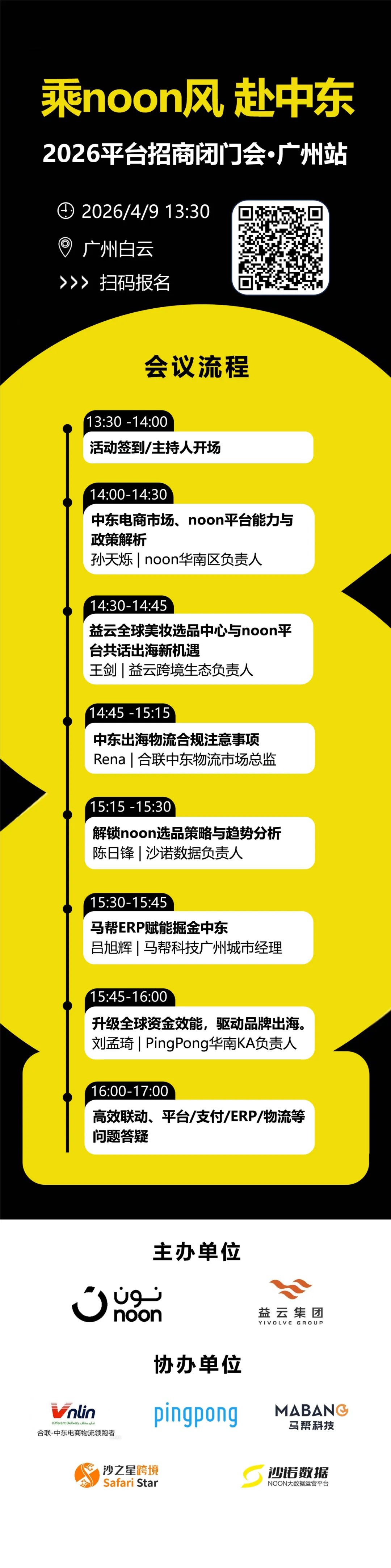 4月9日(周四)下午,广州白云,noon 官方牵头的闭门招商会,直接把中东出海的全链路解决方案摆在你面前: