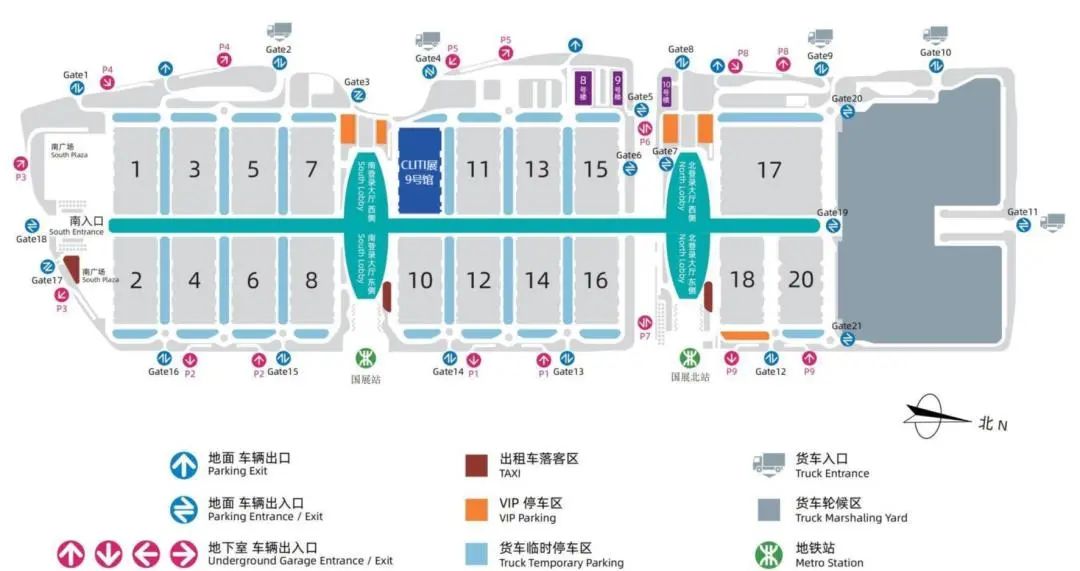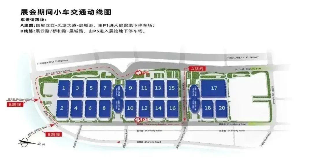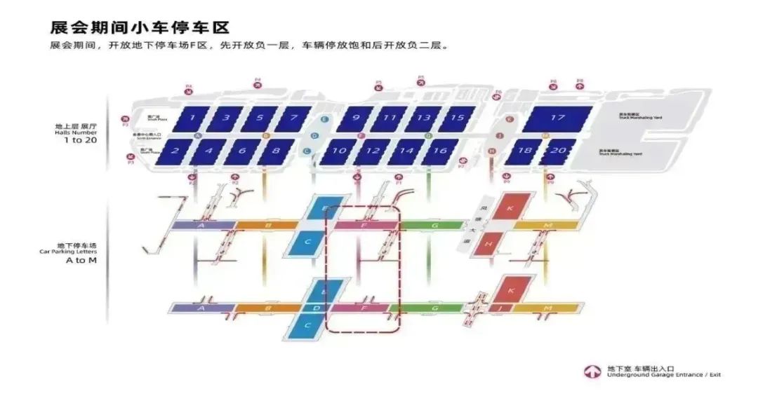 由P1或P5地下停车场入口进入展览中心,在F区负一层或负二层停车。