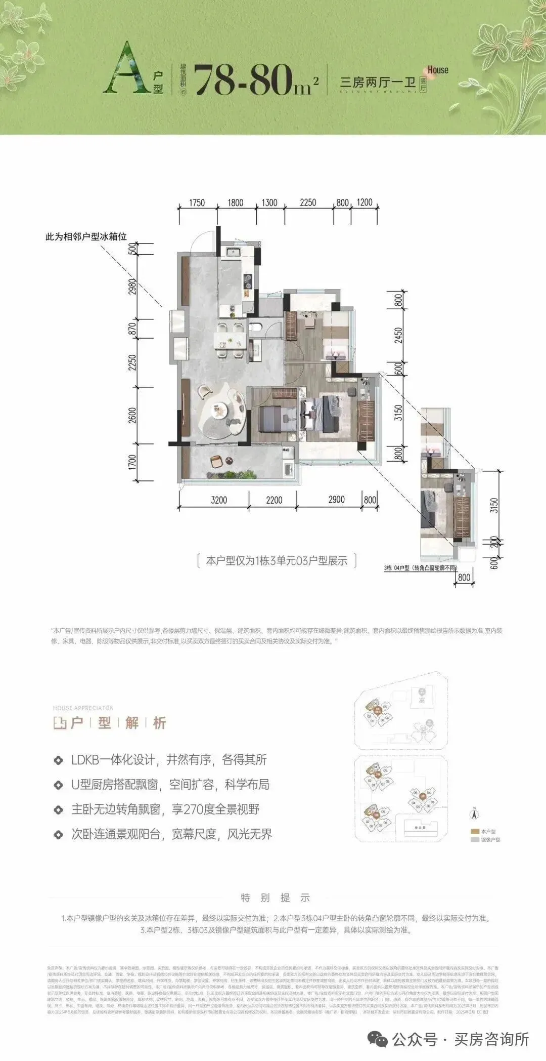 这是建面约80平3房,经典品字型设计,格局方正、动静分区,最大特点是每个空间都非常开阔舒适。