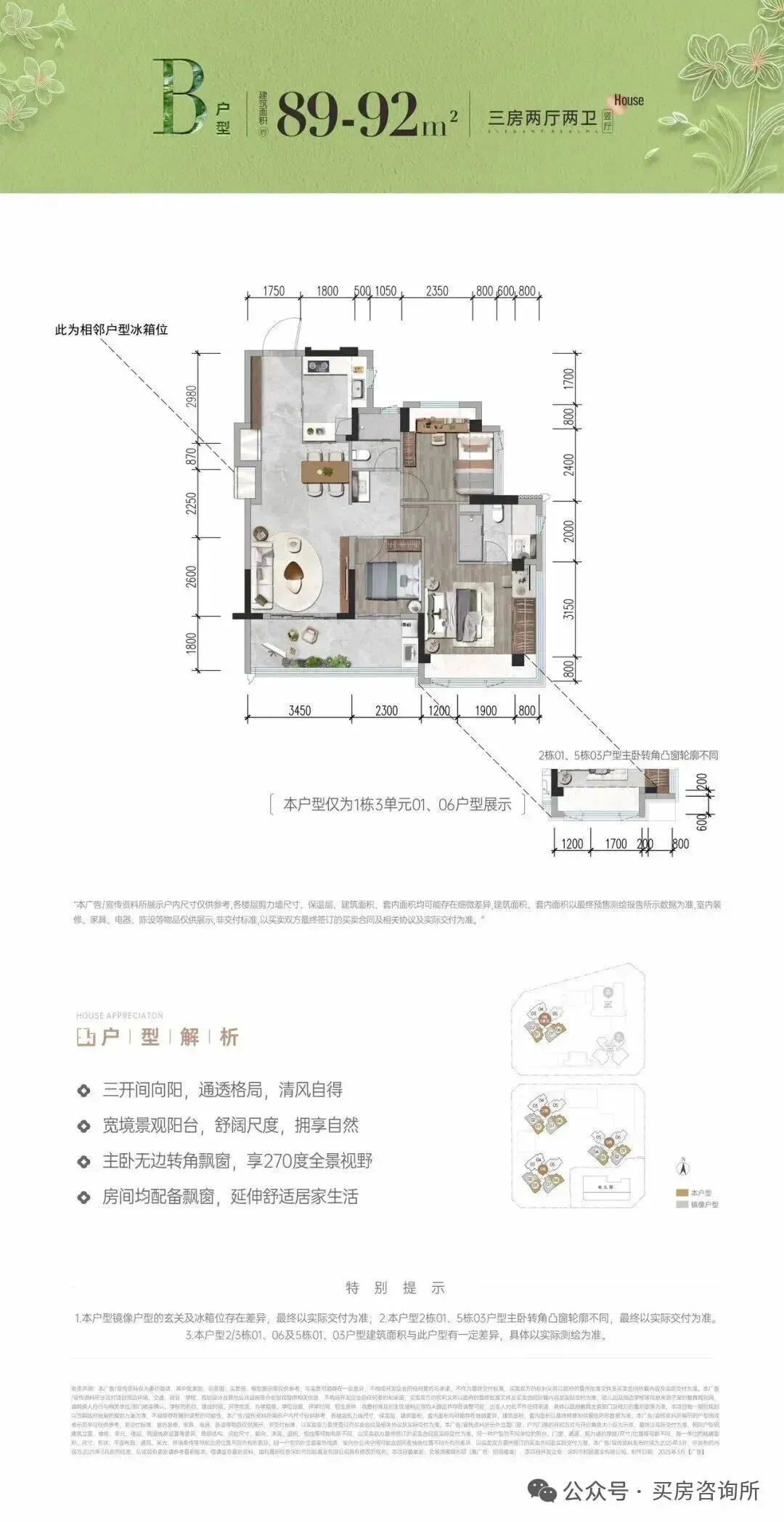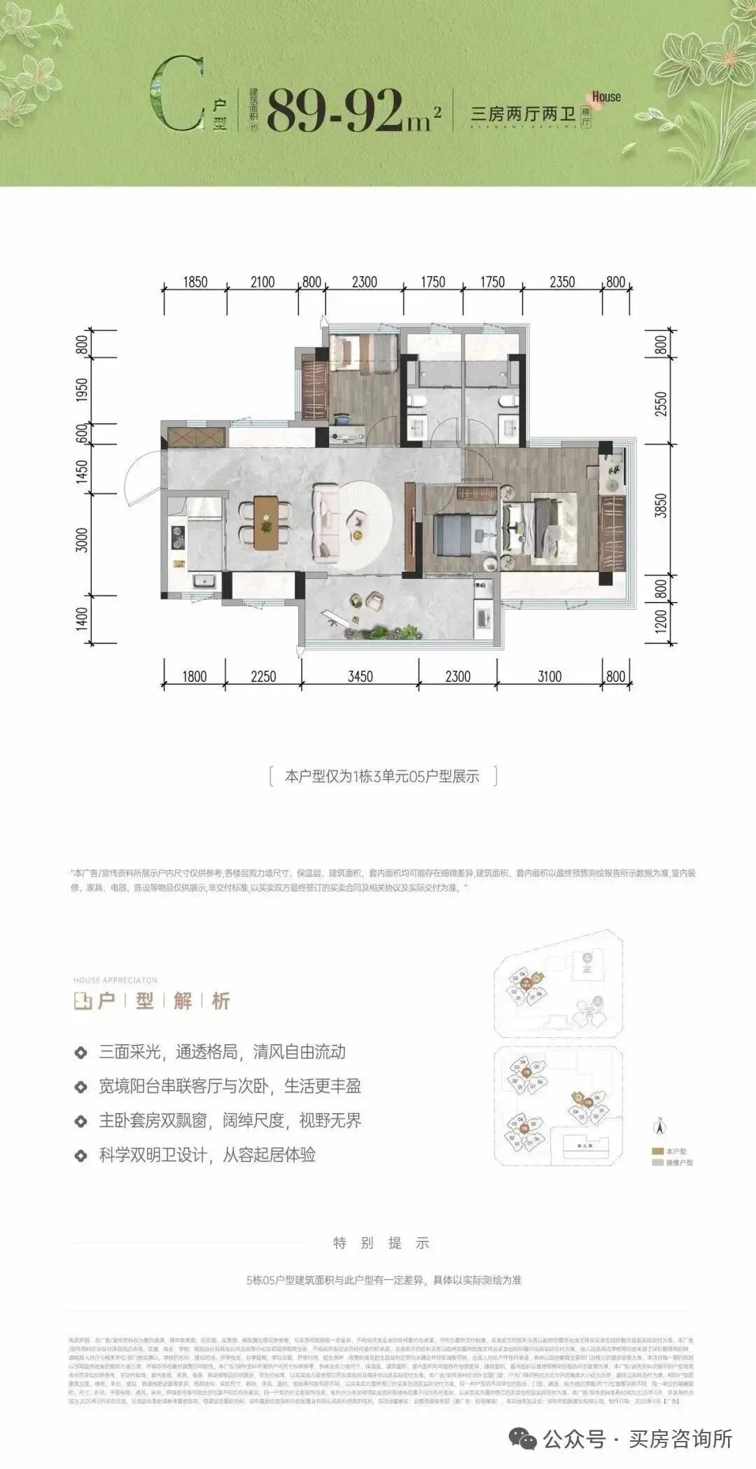 建面约92平3房的阔绰度更是惊人,约105%的得房率,阳台面积超10平,基本和市面主流170平的房子相当。