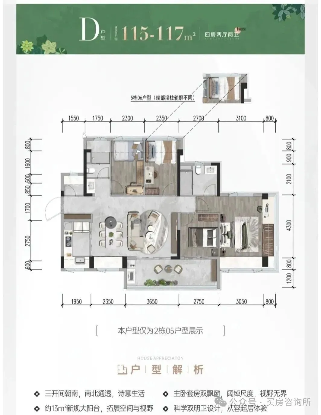 而且此户型5开间朝南,餐厅处南北飘窗对流,主卧L型大飘窗,两个卫生间也带飘窗,采光超绝,令人身心舒畅。
