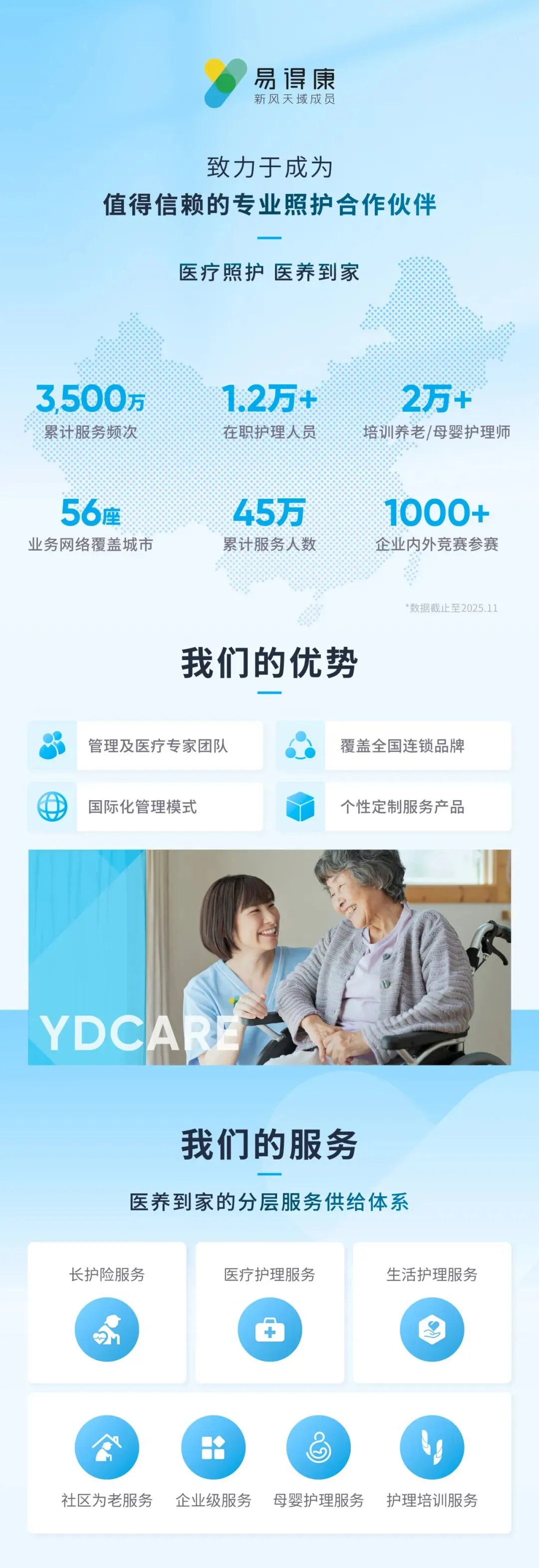 旗下香港及国际业务线品牌「YDCare」通过引入居家静脉营养治疗、伤口负压治疗等先进技术,在缓解香港医疗系统压力的同时,提升长者群体的生活质量与生命尊严。