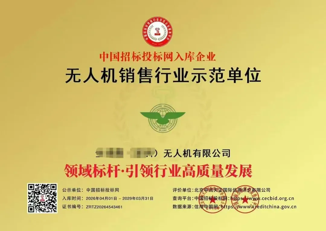 《无人机销售行业示范单位企业资质证书》是由权威第三方评价机构,依据行业市场调研与信用评估规范,对企业在无人机销售领域的市场份额、服务能力、行业口碑、合规经营等核心指标进行综合评定后,由中国招标投标网公示颁发的权威资质凭证。