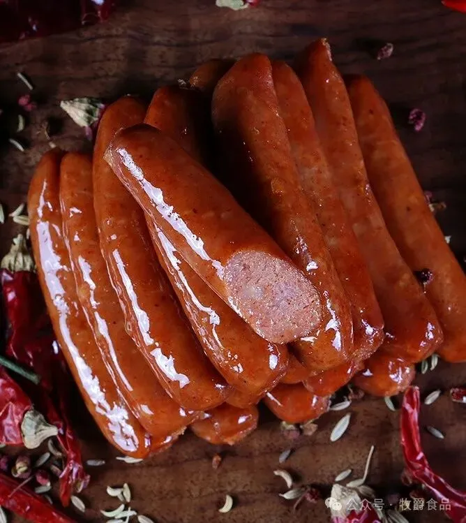 辣味肠精选优质猪肉,融入热辣辛香调料,经精细腌制与熏烤工艺,肉质紧实,辣味醇厚,口感弹牙,开袋解冻或烹饪皆佳 。