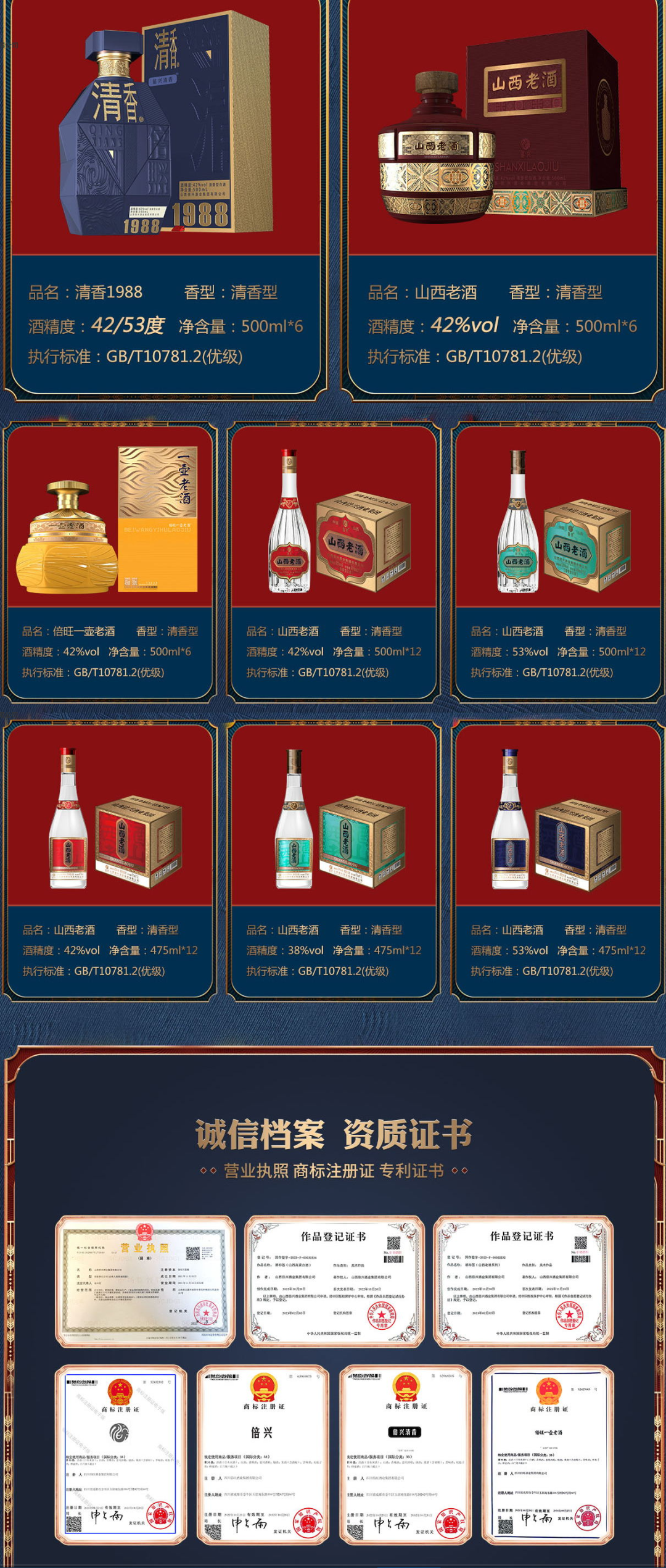 徐缘记系列酒在打造硬核产品品质的基础上,在产品的外包装上也下足了功夫,投入大量资金聘请专业设计团队对产品的外瓶包装进行设计,且所属外包装均在国家知识产局进行备案,拥有自主产品保护。