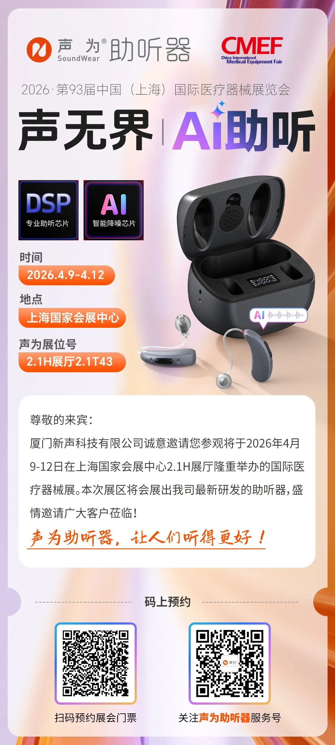 2026 年 4 月 9 日 —12 日,第 91 届 CMEF 中国国际医疗器械博览会将在上海国家会展中心隆重举办。声为作为新声的旗舰级子品牌,携多款新品亮相 2.1H 展厅 2.1T43 展位,向业界与用户展现:AI 科技正推动助听器从辅助聆听工具,升级为更智能、更有温度的陪伴。
