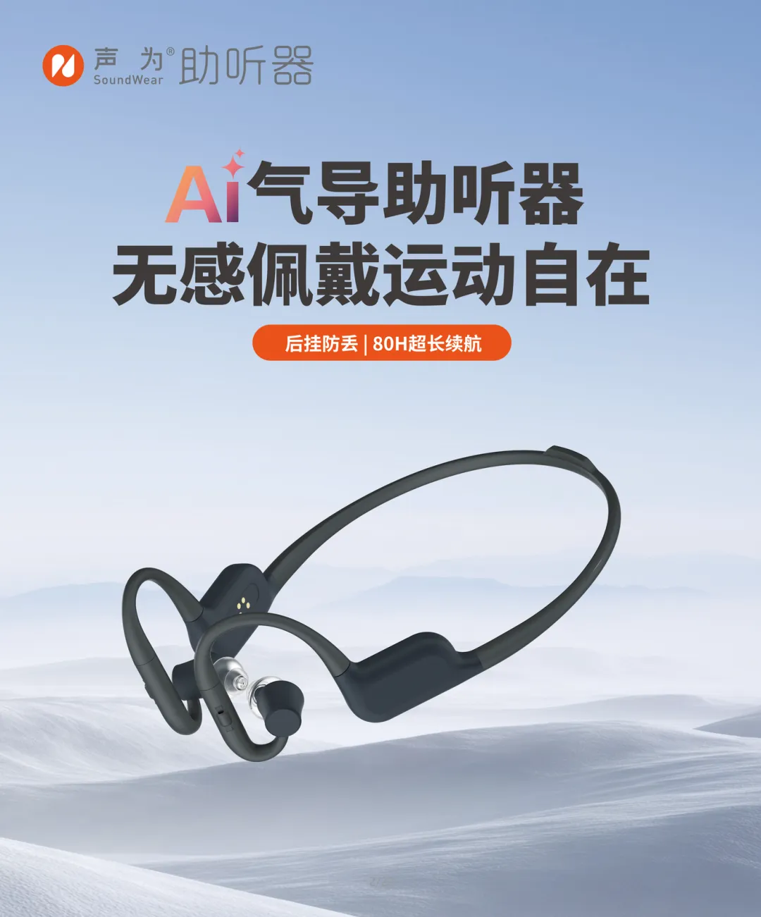 声为首次将穿戴美学与智能声学融为一体,AI芯片轻巧地藏在运动型气导助听器之中。你看到它不会联想到助听,它却无时无刻不在倾听、理解、优化。