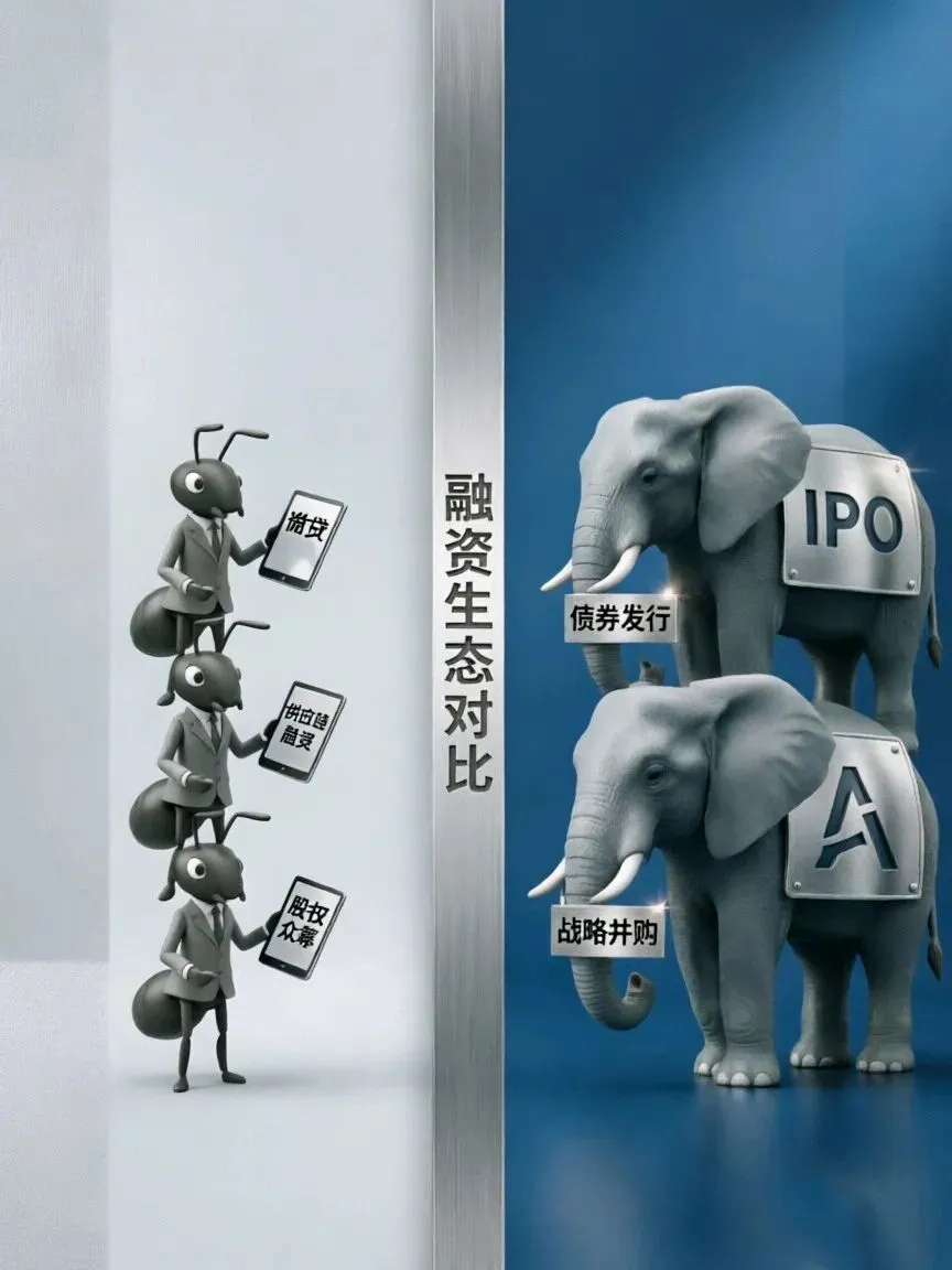 中小微企业和大型企业,就像“小蚂蚁”和“大象”,在融资路上各有各的玩法。中小微企业得“八仙过海各显神通”,大型企业则是“财大气粗选择多”。