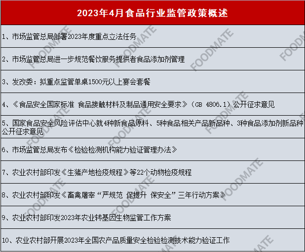 食品伙伴网讯 2023年4月,国家市场监管总局、国家食品安全风险评估中心、农业农村部等监管部门发布了一系列食品行业监管政策,食品伙伴网整理汇总如下: