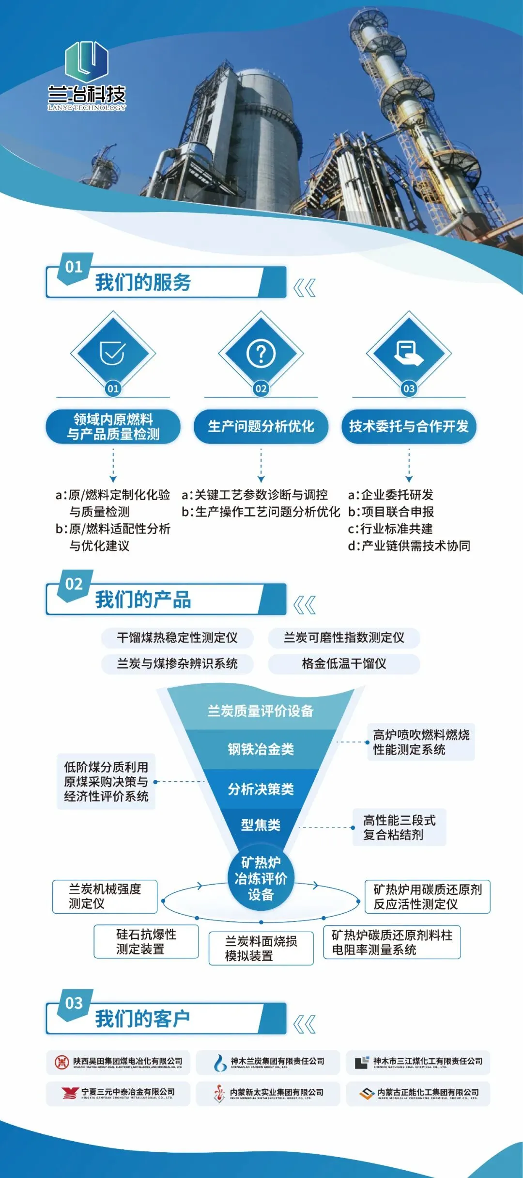 目前企业生产销售的主要产品有:兰炭、煤焦油、煤气、石灰、脱硫剂等环保节能产品,正常年产值可达到4.8亿元。