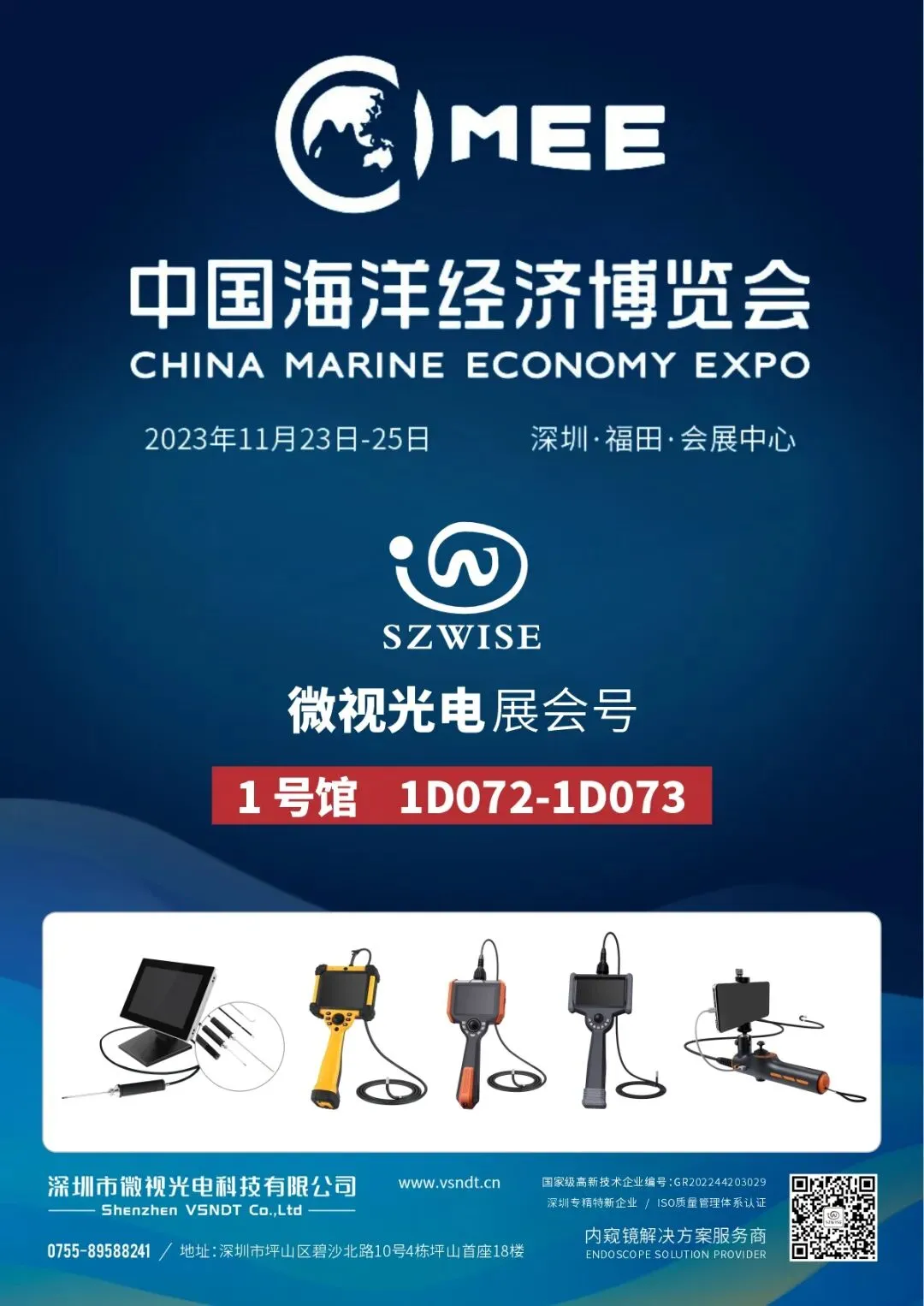 以“开放合作、共赢共享”为主题的2023中国海洋经济博览会将在11月23日-25日在深圳福田会展中心举办;深圳微视将携带自主研发的WS-F系列、WS-Y系列、WS-K系列、WS-P系列等主推工业内窥镜产品,为海洋船舶综合检测技术提供解决方案和检测案例,深圳微视展位号:1号馆1D072、1D073;我们诚挚邀请业内专业人士莅临展位现场,和我们共同分享无损检测的技术经验和成果。