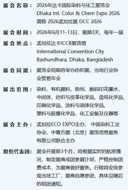 应广大会员单位的需求,考虑到孟加拉市场的重要性,2026年中国染料工业协会将组织行业内企业前往孟加拉参展。