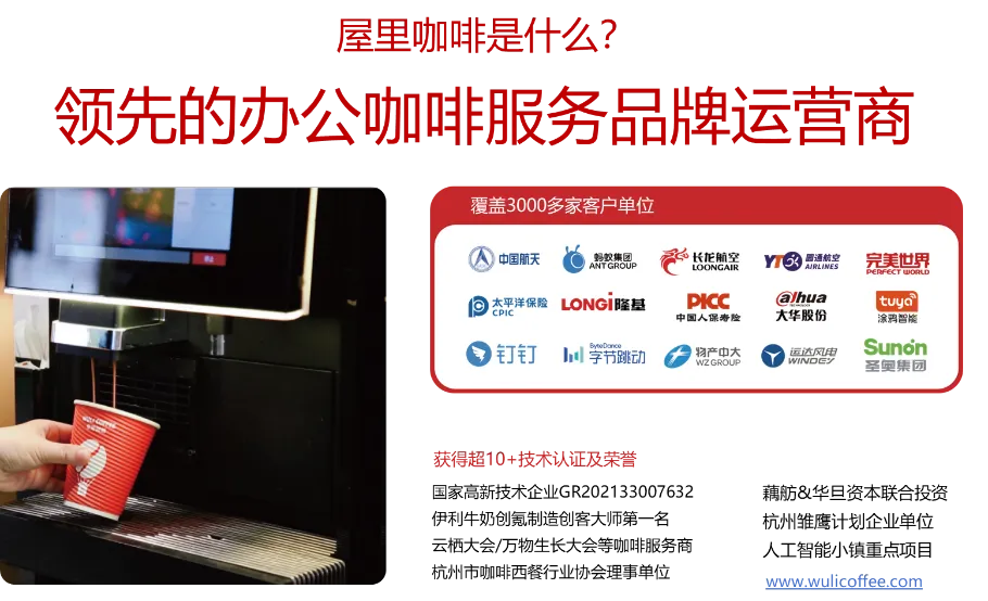 屋里咖啡(WULI COFFEE)是国内领先的一站式商用咖啡服务提供商,隶属于杭州全在屋里智能科技有限公司,专注为酒店、政企单位、商业空间等提供全链路咖啡服务解决方案。