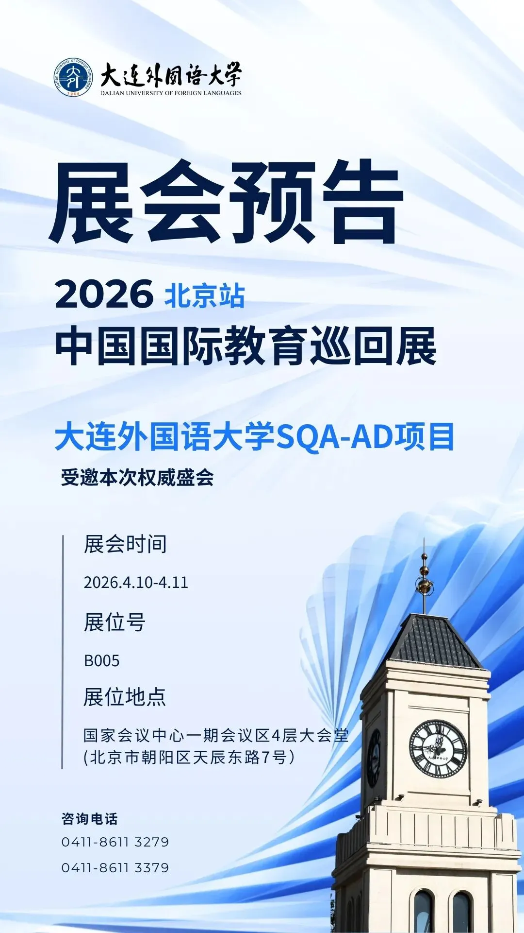 由教育部留学服务中心主办的2026年(第三十一届)中国国际教育巡回展暨2026中国留学论坛即将于4月10日-11日盛大启幕。在4月11日北京站,大连外国语大学SQA-AD项目作为官方直属办学的国际化本科项目,受邀重磅亮相本次权威盛会,诚邀广大师生、家长莅临交流,共话国际教育新机遇!