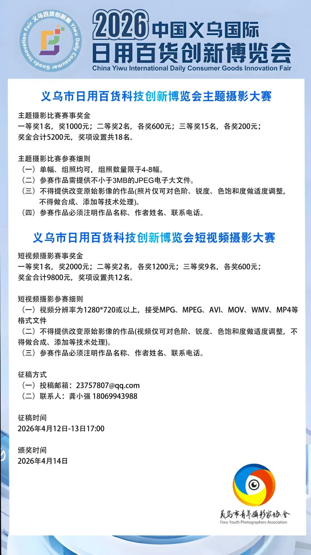 为展现日用百货科技创新博览会,以场景化、年轻化和数字化特色,以创新带动新潮流,为日用百货行业打造一个全新的展示交易平台。特举办义乌国际日用百货创新博览会主题摄影大赛暨义乌国际日用百货创新博览会短视频摄影大赛,面向全社会摄影家、摄影爱好者征集优秀摄影作品。专业摄影师、业余爱好者均可以参赛,不限参赛人员国家(地区)和国籍。