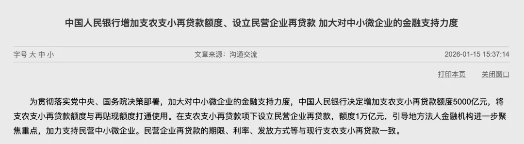 2026年1月,中国人民银行设立民营企业再贷款,激励引导地方法人银行加力支持民营中小微企业。