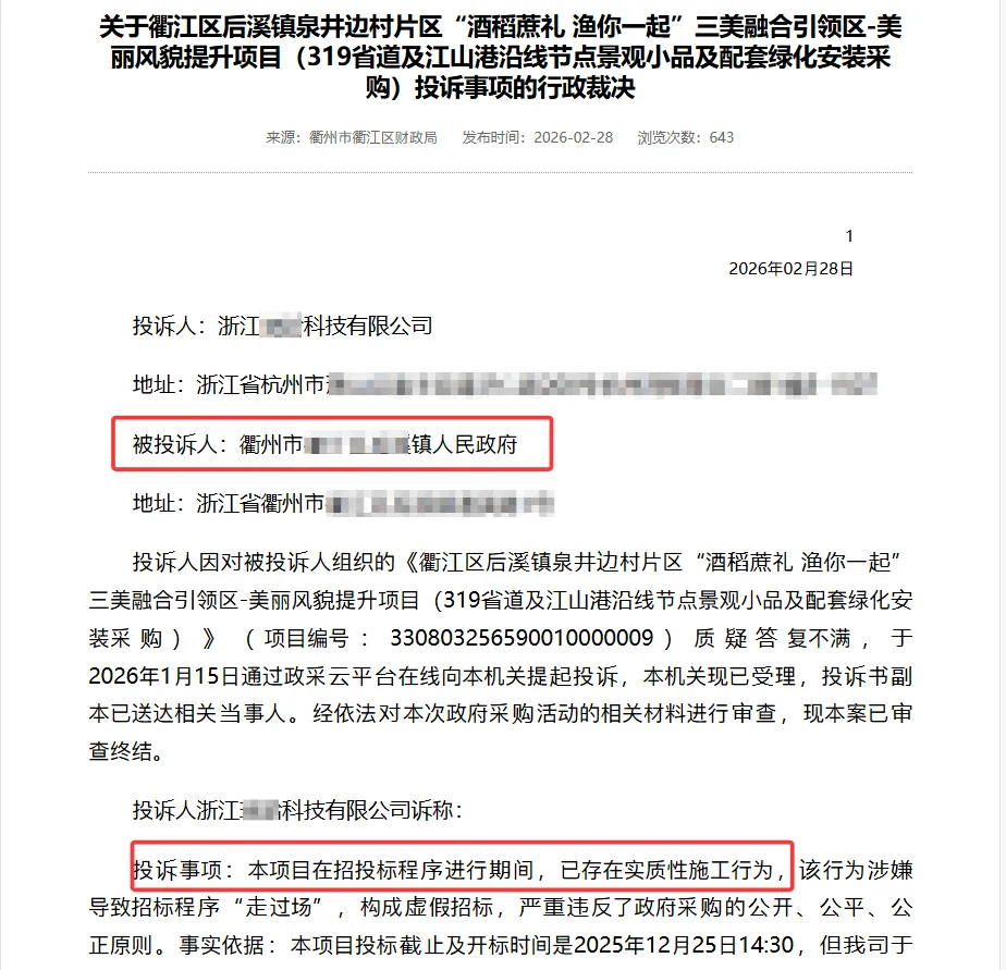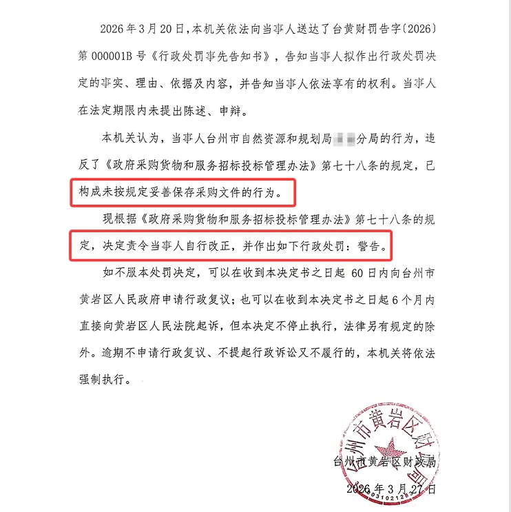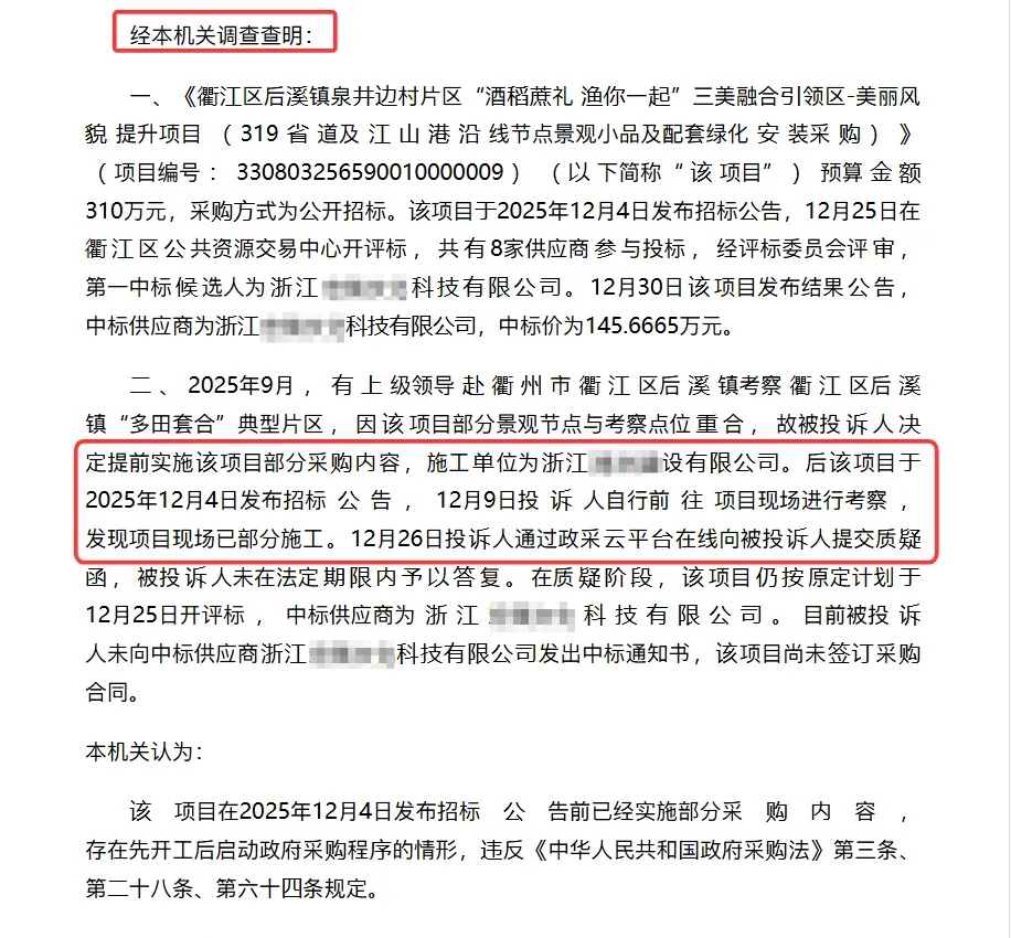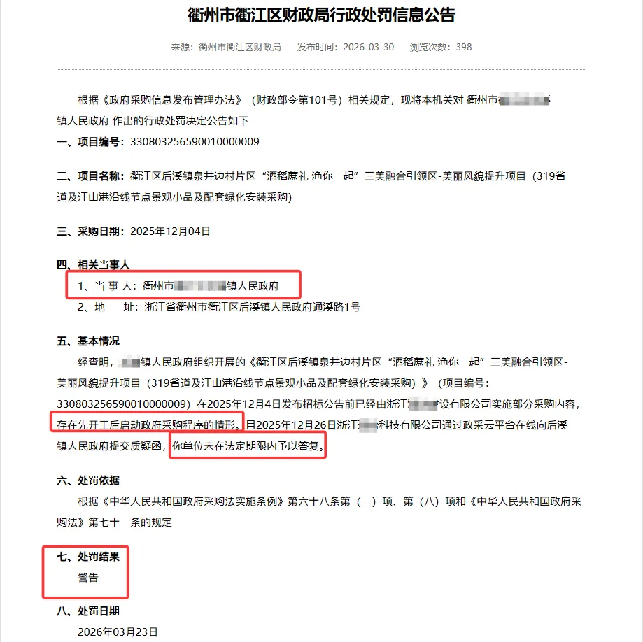 好家伙,2015年的项目了,2026年被处罚,将近10年了吧。 你说冤吧?按理说政府机构保存资料应该是很稳妥的呀,法规中也明确了《政府采购货物和服务招标投标管理办法》“第七十六条 采购人、采购代理机构应当建立真实完整的招标采购档案,妥善保存每项采购活动的采购文件。”。 你说不冤吗吧?将近10年前的项目材料了,估计领导或者管理员都换了几任了。 两个方面问题,先开工后采购,以及未在法定期限内答复质疑。 有小伙伴还没反应过来,你想想,实施要有具体供应商去实施吧?都开始实施了,后面采购环节该供应商会去投标吗?如果投了谁中? 当然也不是一定就是原供应商中的,但推敲起来不是滋味呀? 继续查询资料,发现原提前实施的供应商并没有中标。还好,不然可能就说不清了。 再看一则该项目的行政裁决,提前了大于1个月左右出的,裁决中也明确了提前实施的情况。[网址:https://zfcg.czt.zj.gov.cn/site/detail?categoryCode=ZcyAnnouncement&parentId=600007&articleId=3LYFpTiJpp4mSvKoirW0aA==] 所以作为采购人,有做得不到位的,该处罚的依然是跑不掉。