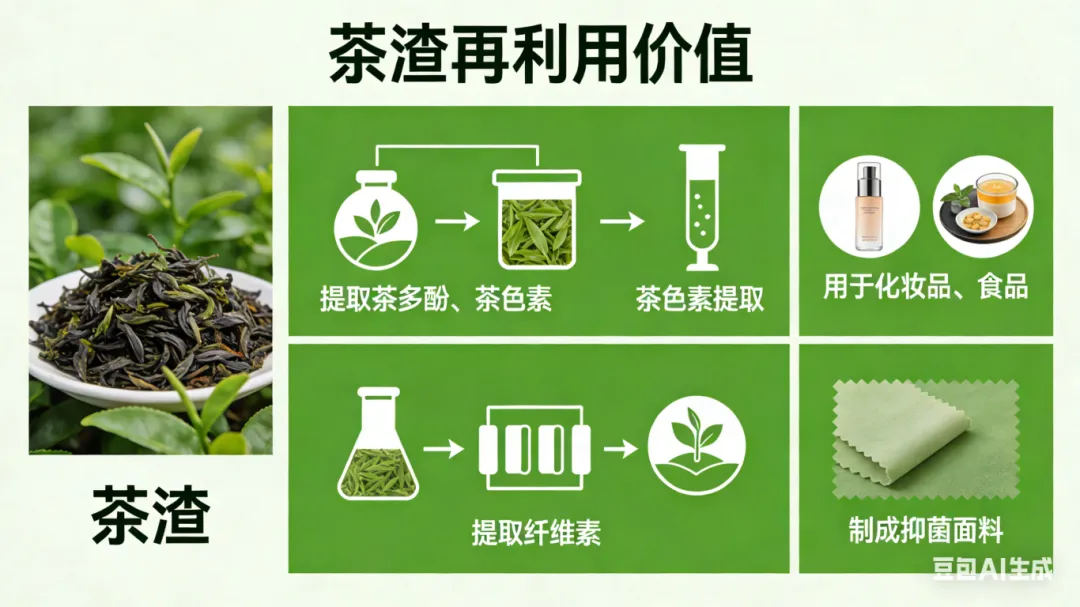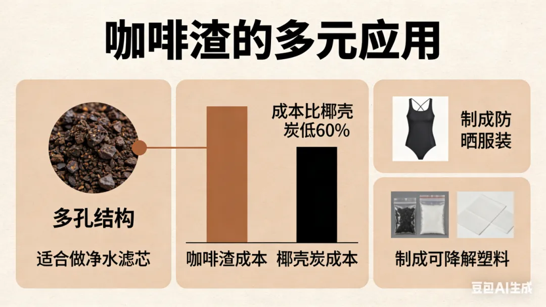 除此之外,茶渣中还能提取茶多酚、茶色素用于化妆品和食品,提取出的纤维素还能制成抑菌面料;咖啡渣的多孔结构则适合做净水滤芯,成本比椰壳炭低60%,还能制成防晒服装和可降解塑料。