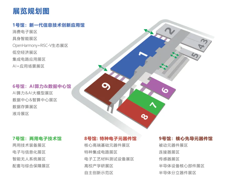 现场分了八大展区,你可以去消费电子馆看最新的AI手机和全屋智能,去具身智能馆体验人形机器人和机器狗,或者在集成电路馆了解国产芯片。此外,低空经济(无人机/eVTOL)、AI大模型算力、电子元器件等展区也都有不少企业展示,适合电子行业从业者去逛逛。