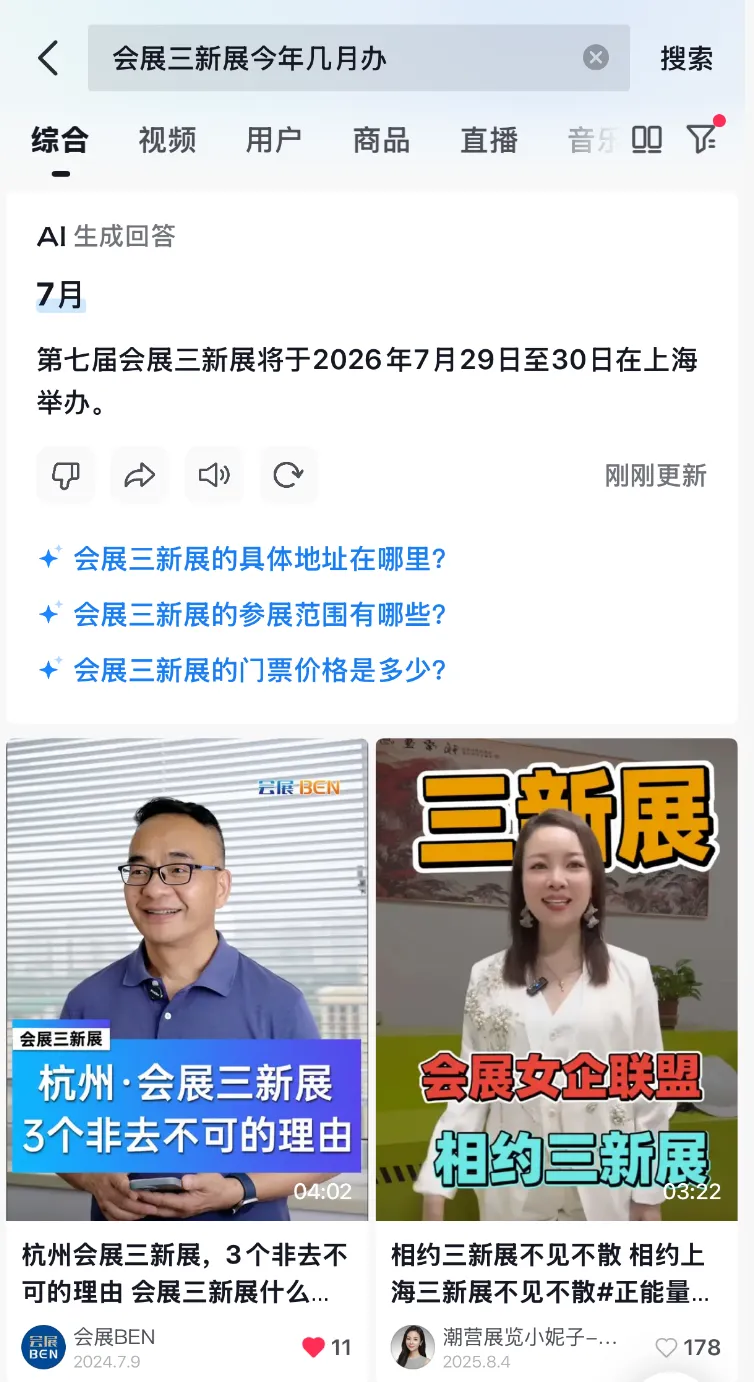 看上图,在搜索框内搜“会展三新展今年几月办”,抖音自动生成了答案,而且是正确的,但我们还没有在抖音发布这个话题的视频,估计答案来自今日头条。