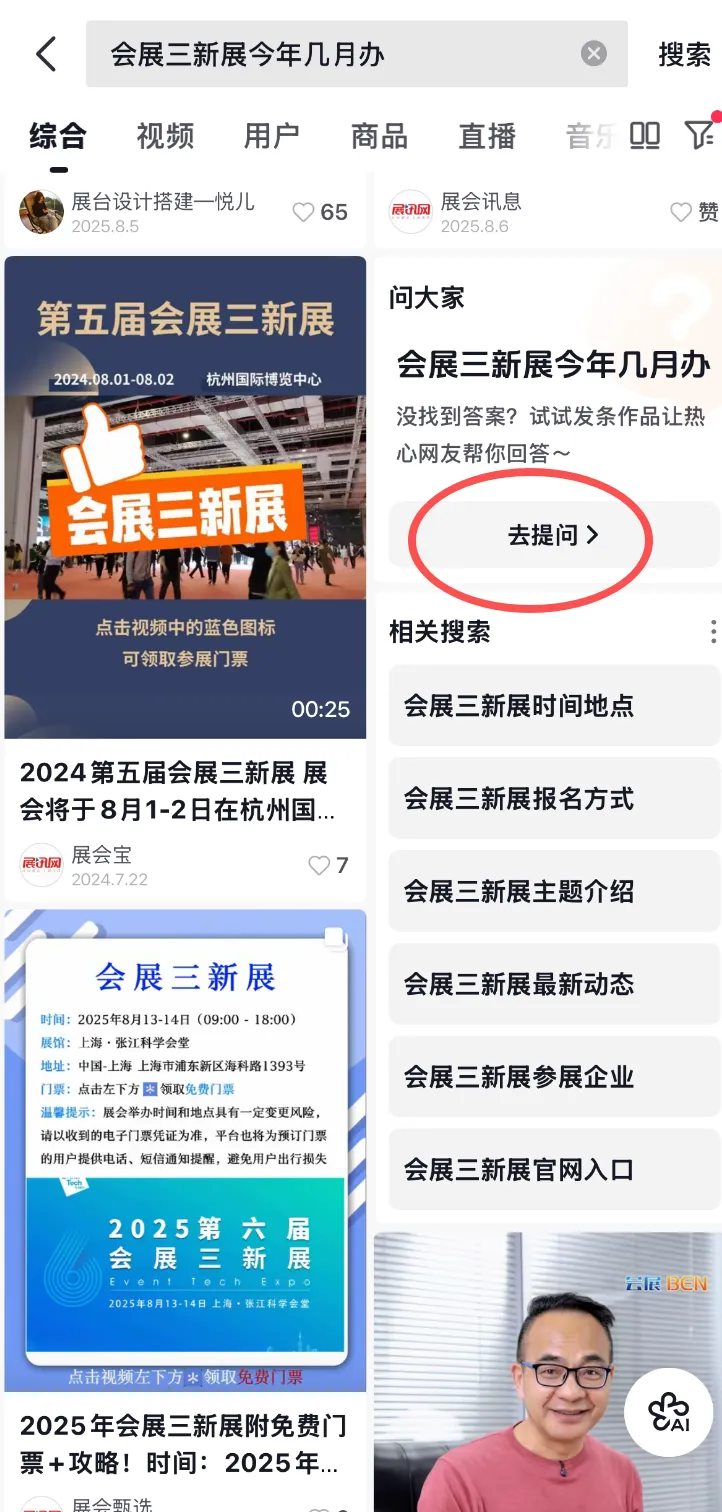 在平台搜索行业、展会、服务相关关键词,查看用户高频提问,比如“2026会展三新展在哪举办?”“会展三新展门票多少钱?”,这些问题就是用户最关心的核心痛点,也是内容创作的精准方向。