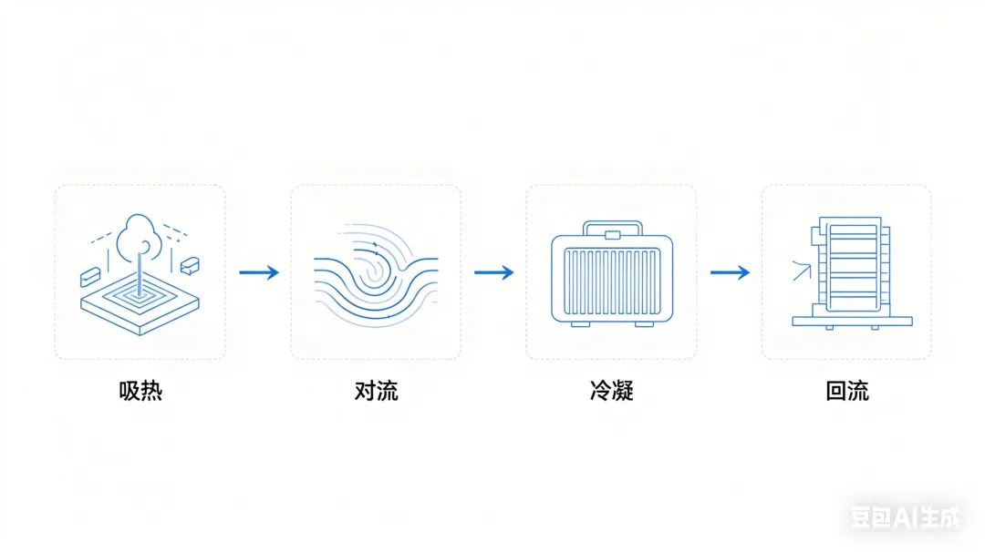 一句话总结工作流程:芯片发热 → 氟化液吸热 → 自然对流上升 → 顶部冷凝降温 → 沉回底部 → 再次循环