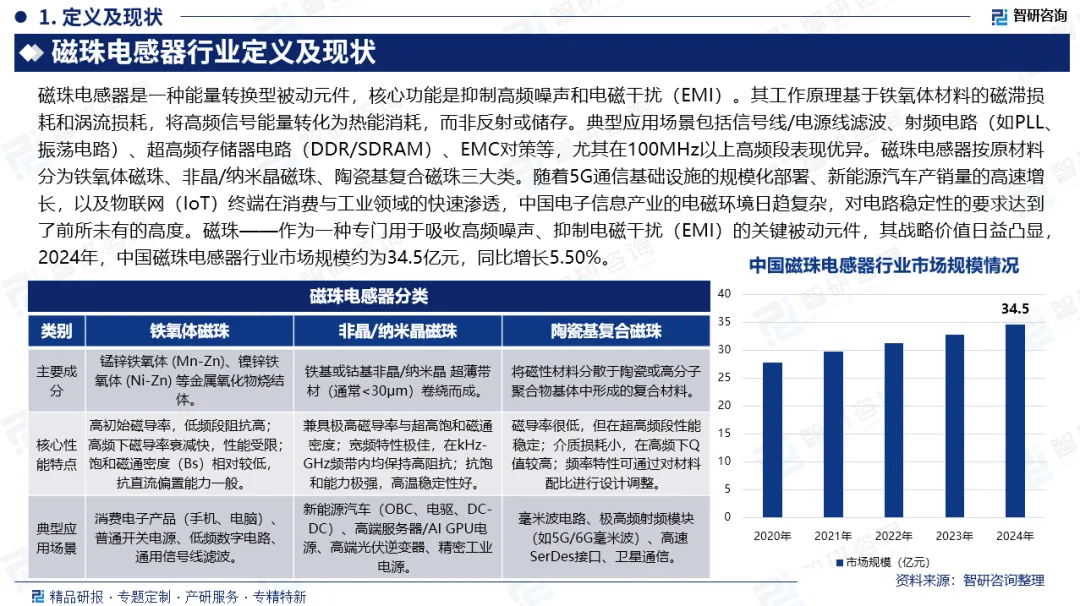 磁珠电感器是一种能量转换型被动元件,核心功能是抑制高频噪声和电磁干扰(EMI)。其工作原理基于铁氧体材料的磁滞损耗和涡流损耗,将高频信号能量转化为热能消耗,而非反射或储存。2024年,中国磁珠电感器行业市场规模34.5亿元,同比增长5.50%。技术演进聚焦高频低损耗、微型化大电流、磁集成化三大方向。未来增长驱动力集中于新能源汽车(800V高压平台)、AI算力基础设施(服务器电源)及高端工业控制等领域,产业竞争模式将升级为全产业链协同竞争,头部企业通过垂直整合与一体化设计构建核心壁垒。