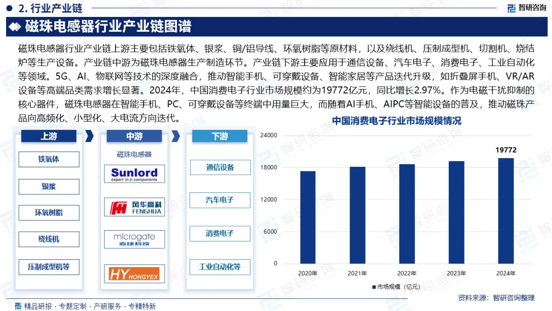 产业链核心节点:5G、AI、物联网等技术的深度融合,推动智能手机、可穿戴设备、智能家居等产品迭代升级,如折叠屏手机、VR/AR设备等高端品类需求增长显著。2024年,中国消费电子行业市场规模约为19772亿元,同比增长2.97%。作为电磁干扰抑制的核心器件,磁珠电感器在智能手机、PC、可穿戴设备等终端中用量巨大,而随着AI手机、AIPC等智能设备的普及,推动磁珠产品向高频化、小型化、大电流方向迭代。