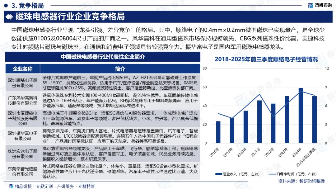竞争情况:中国磁珠电感器行业呈现“龙头引领、差异竞争”的格局。其中,顺络电子的0.4mm×0.2mm微型磁珠已实现量产,是全球少数能供应01005及008004尺寸产品的厂商之一,并通过车规级AEC-Q200认证切入比亚迪、特斯拉供应链,在AI服务器、5G通信等高端场景占据技术制高点。风华高科作为本土代表性企业,依托1996年国内首条片式电感生产线的先发优势,在通用型磁珠市场保持规模领先,CBG系列磁珠性价比高,2025年申请叠层铁氧体磁珠专利改善产品一致性,大规模生产能力突出。麦捷科技专注射频贴片磁珠与磁珠排,在通信和消费电子领域具备较强竞争力。振华富电子背靠中国振华集团,是国内军用磁珠电感器龙头,产品覆盖全系列片式电感器与磁珠。