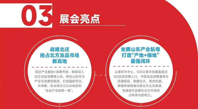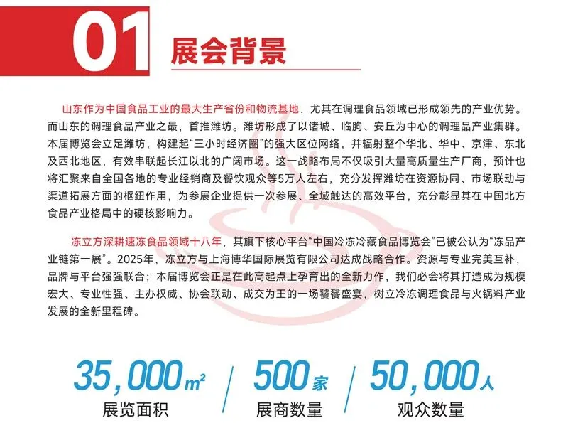 作为深耕行业18年的“冻品产业链第一展”,本届展会规模达3.5万㎡,汇聚500+行业头部企业,预计吸引5万+专业观众。重点聚焦冷冻调理食品、火锅料、烧烤食材及预制菜全产业链,依托山东食品产业高地优势,打造辐射华北、华中及北方市场的产销对接核心平台。