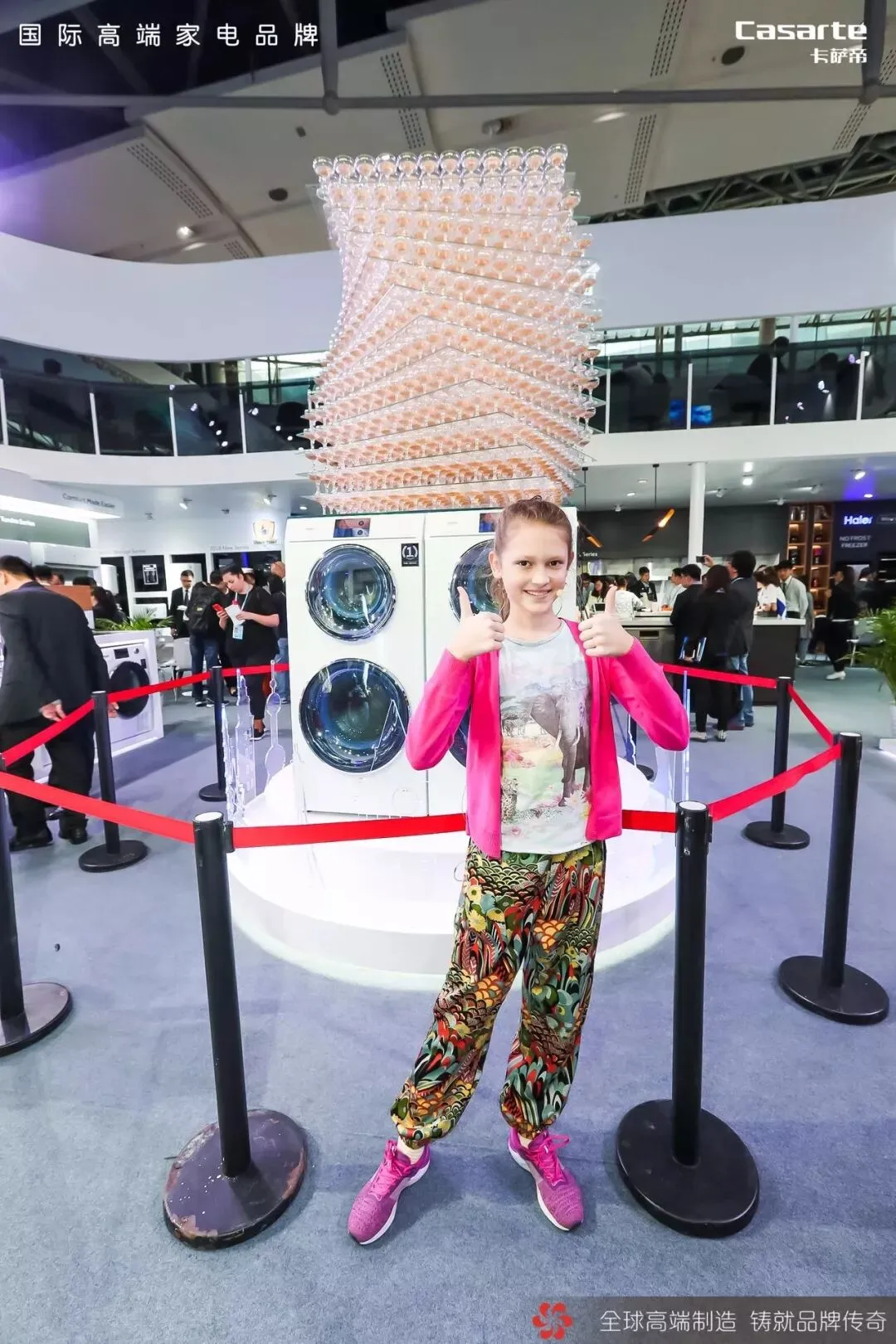 自诞生之日起就备受行业瞩目,且一直被模仿却从未被完全复制成功的17KG双子云裳洗衣机在广交会现场全速运转,12层香槟塔平稳矗立,这一优雅壮观的景象理所当然成为了广交会现场焦点,各国外商纷纷合影留念,一位小姑娘更是开心的面朝镜头为卡萨帝竖起了大拇指。