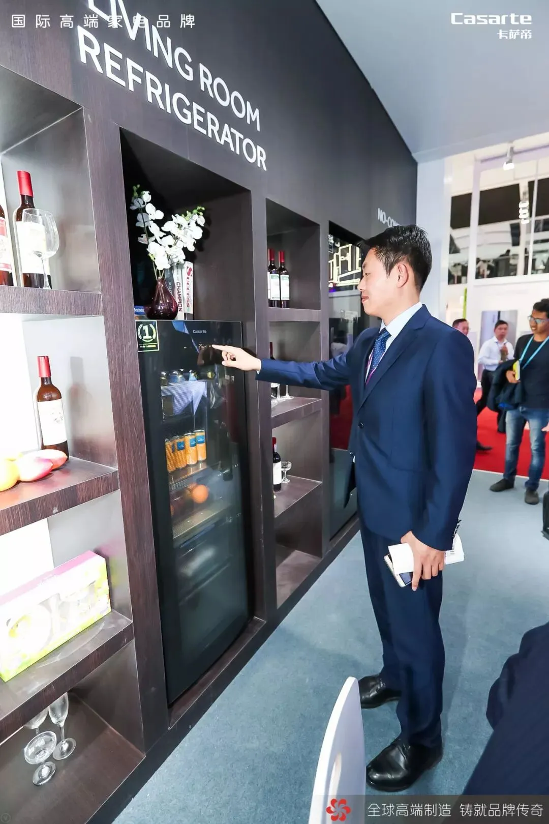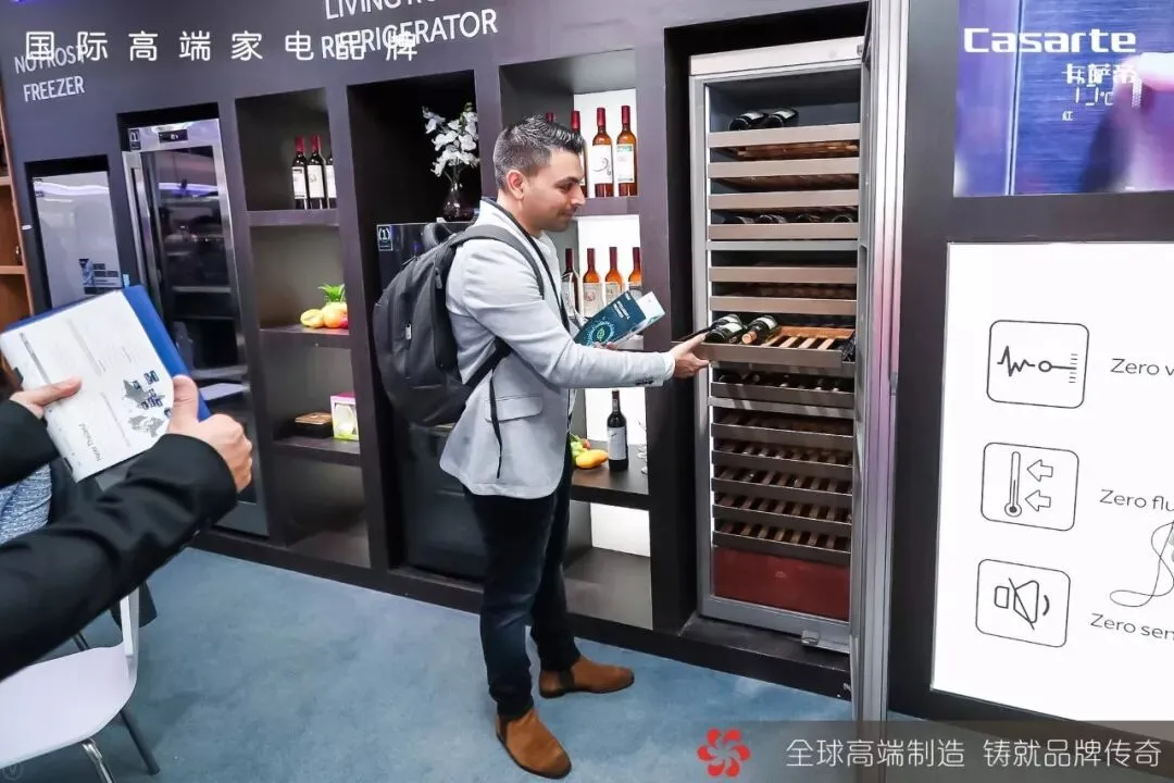 展品前,几名来自俄罗斯的外商在热情的交流,分享着从现场工作人员那里学习到的卡萨帝打造酒窖级储酒环境的秘密所在,其中一位外商更是打开酒柜,近距离感受了一番。