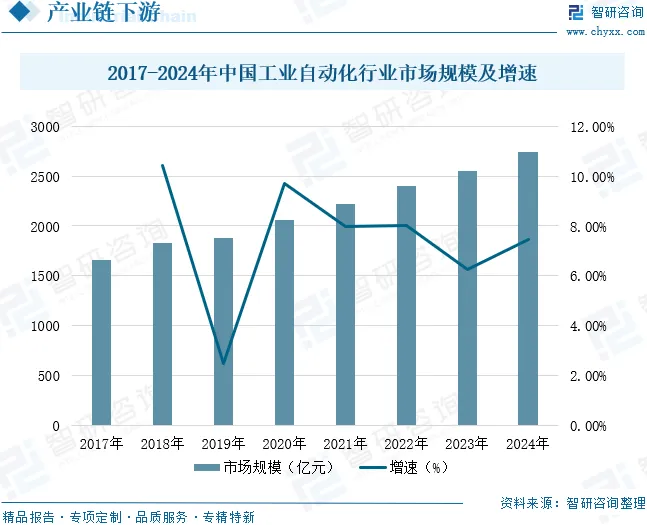 工业自动化是电动缸的应用领域之一。在机械加工行业,电动缸可用于数控机床的进给系统,实现高精度的刀具移动和定位,提高加工精度和效率。在自动化生产线中,电动缸可用于物料搬运、装配作业等环节,如将工件准确地推送或抓取到指定位置,替代传统的气缸或液压缸,具有动作平稳、控制、响应速度快等优点。工业自动化涉及电力、电子、计算机、人工智能、通讯、机电等诸多领域,近年来随着工业自动化技术的不断成熟,生产、控制、反馈和辅助装置等工业自动化设备在机床、新能源、工业机器人、医疗等行业的应用规模不断扩大,工业自动化市场得到了长足的发展。数据显示,中国工业自动化行业市场规模从2017年的1657亿元增长至2024年的2739亿元,年复合增长率为7.44%。未来,随着工业4.0的深入推进和工业自动化水平的持续提升,将为电动缸行业带来更广阔的应用场景和持续增长的市场需求。