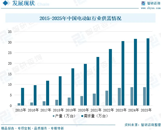 电动缸的发展始于工业自动化领域的需求提升。早期产品主要采用直流电机配合丝杠结构,将旋转运动转化为直线运动,虽然结构简单,但在精度、速度和负载方面存在局限。随着技术进步,交流电机因其更高效率、更强功率和更优调速性能逐渐成为主流驱动源,数字控制系统的引入进一步提升了运动的精确性与稳定性。材料方面,高强度铝合金、不锈钢等材料的应用增强了电动缸的轻量化与耐腐蚀性,密封与润滑技术的改进也延长了其使用寿命。近年来,随着工业自动化与智能制造的推进,电动缸凭借高精度、高可靠性及节能环保等优势,在航空航天、汽车制造、医疗器械、机器人等领域逐步替代传统液压与气动系统,成为关键自动化部件。数据显示,中国电动缸行业产量从2015年的1.07万台增长至2025年的8.73万台,年复合增长率为23.36%;需求量从2015年的8.35万台增长至2025年的31.8万台,年复合增长率为14.31%。未来,随着工业自动化与智能制造的深入推进,电动缸产量与需求量将持续协同增长。