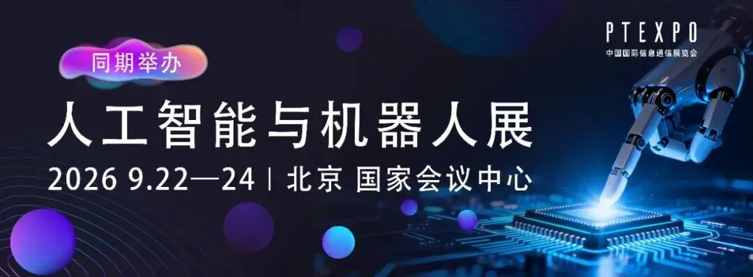 作为全球信息通信领域极具影响力的年度盛会,2026年中国国际信息通信展览会(PT EXPO CHINA)将于9月22-24日在北京国家会议中心隆重举办。本届展会紧扣数字中国、网络强国、新型工业化等国家战略部署,聚焦 “人与科技” 协同发展的时代主题。展会同期举办人工智能与机器人展,集中展示人工智能与机器人领域关键核心技术,以及赋能新型工业化的创新应用成果。