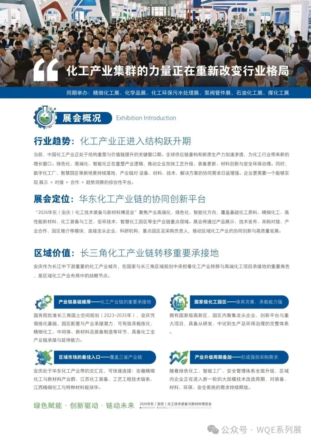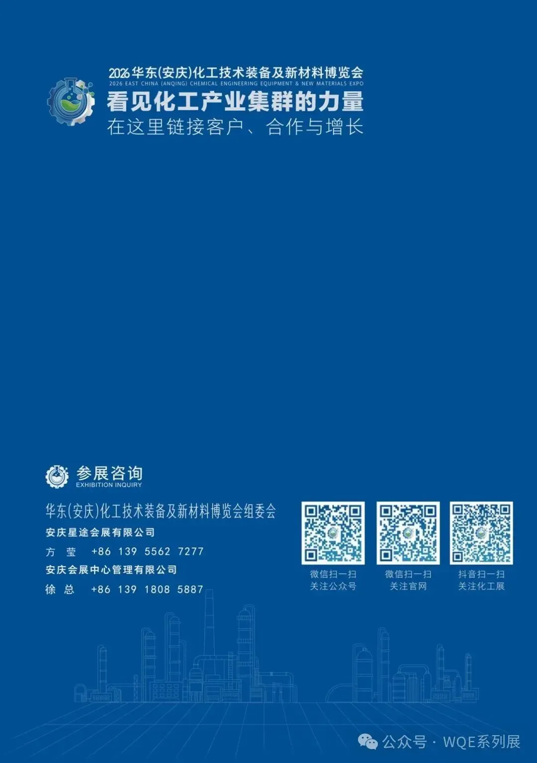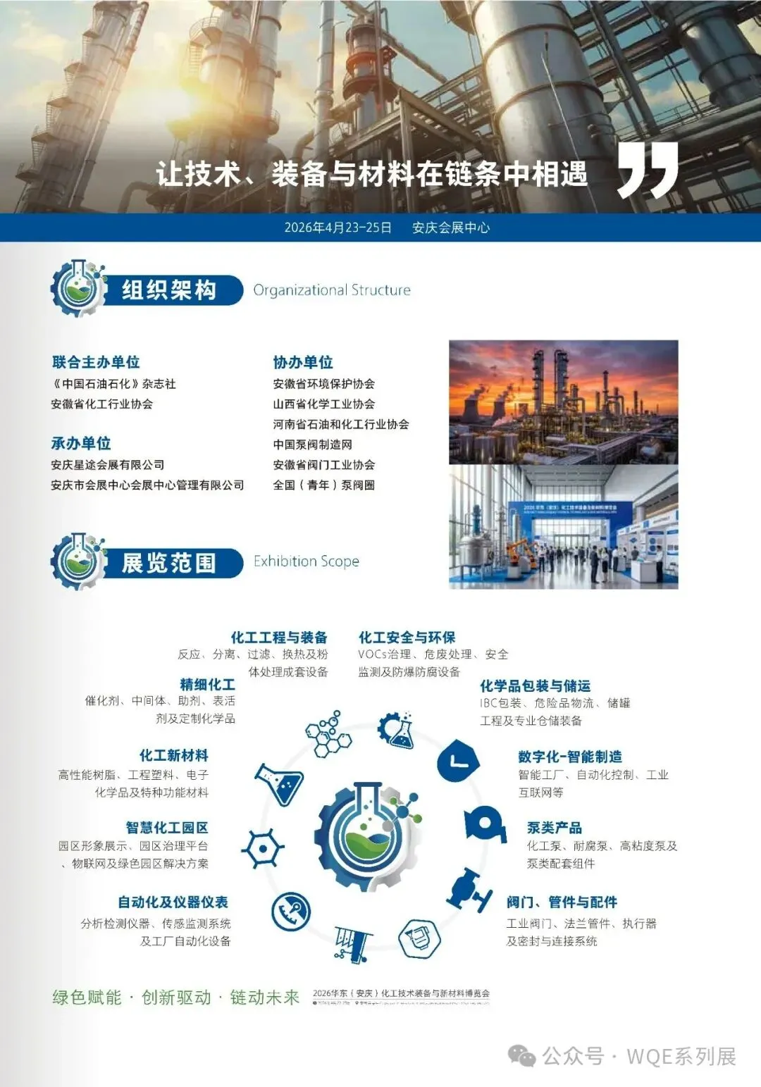 点击蓝字,关注我们 4 月 23-25 日,以 “绿色赋能・创新驱动・链动未来” 为主题的 2026 华东(安庆)化工技术装备与新材料博览会,在安庆会展中心隆重举行。作为立足安庆、辐射华东、链接全国的化工产业顶级盛会,本届展会聚焦化工高端化、智能化、绿色化转型,汇聚 400 余家行业领军企业,展出面积超 3 万平方米,集中呈现基础化工原料、高端精细化学品、节能环保装备、智能安全管控及密封解决方案等全产业链前沿成果,为化工产业高质量发展搭建起技术交流、商贸对接、资源协同的核心平台。