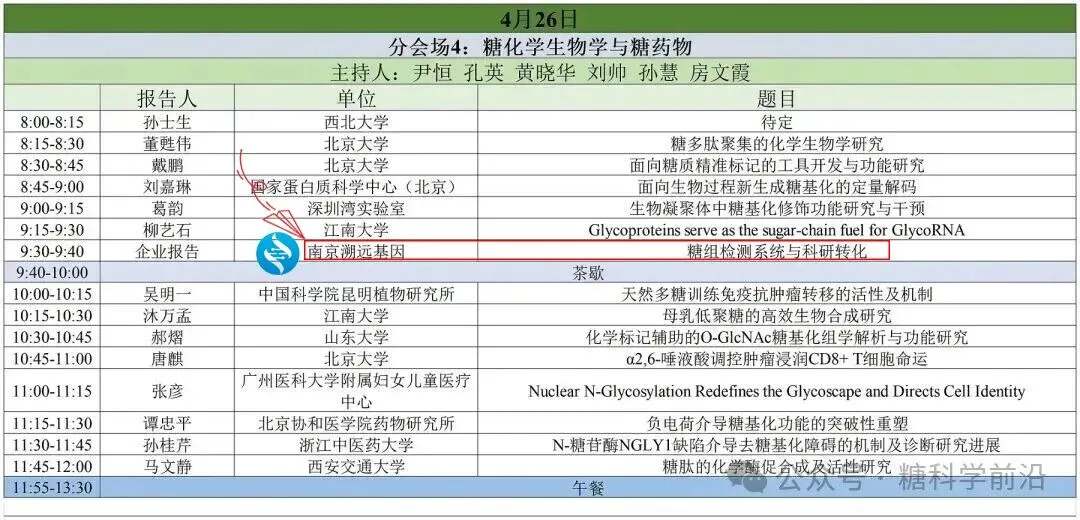 诚邀关注糖组学的同仁莅临 4 月 26 日9:30-9:40分会场4!南京溯远基因将以《糖组检测系统与科研转化》为主题,深度分享糖组检测技术体系。